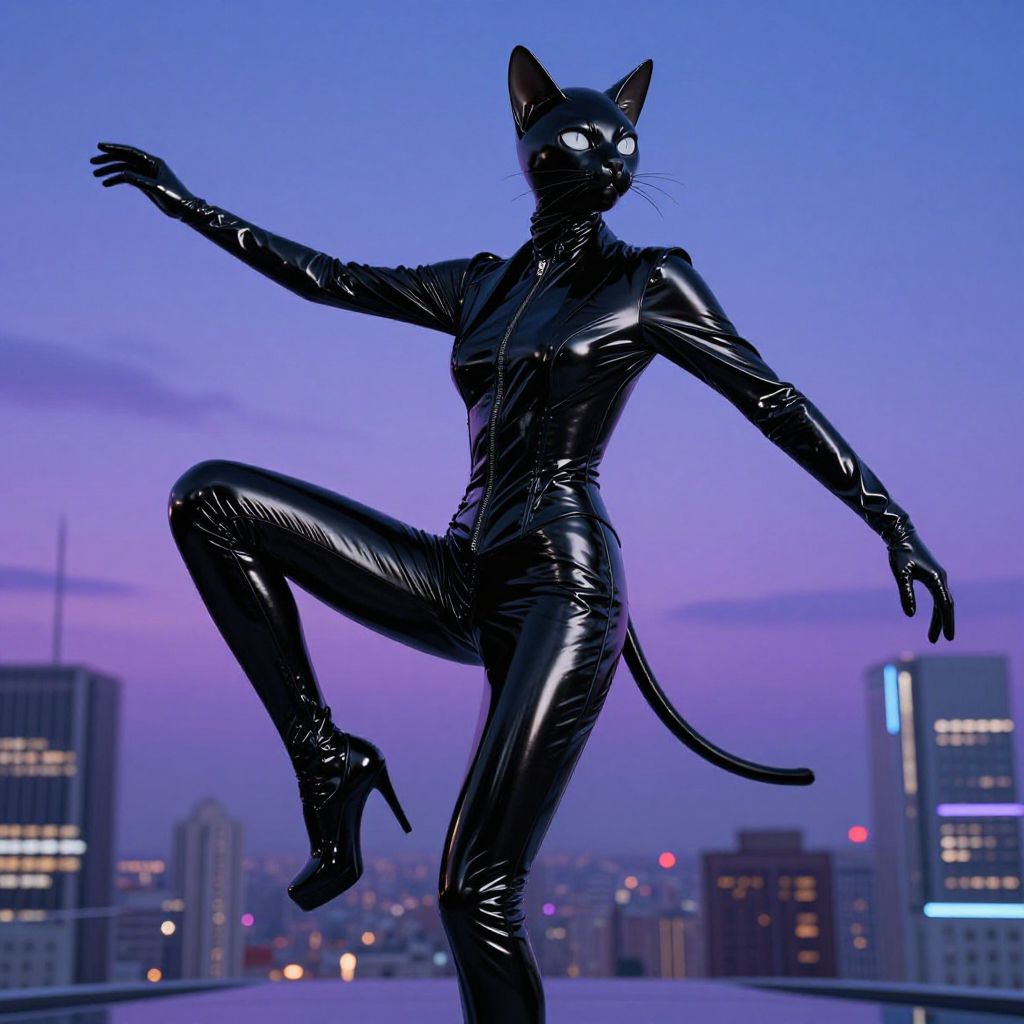 Cat in a form-fitting black gimp suit, stylized artwork with emphasis on latex material's reflective qualities, dynamic pose showing agility, set against a futuristic cityscape at dusk with purple and blue gradient skies, capturing both elegance and mystery.
