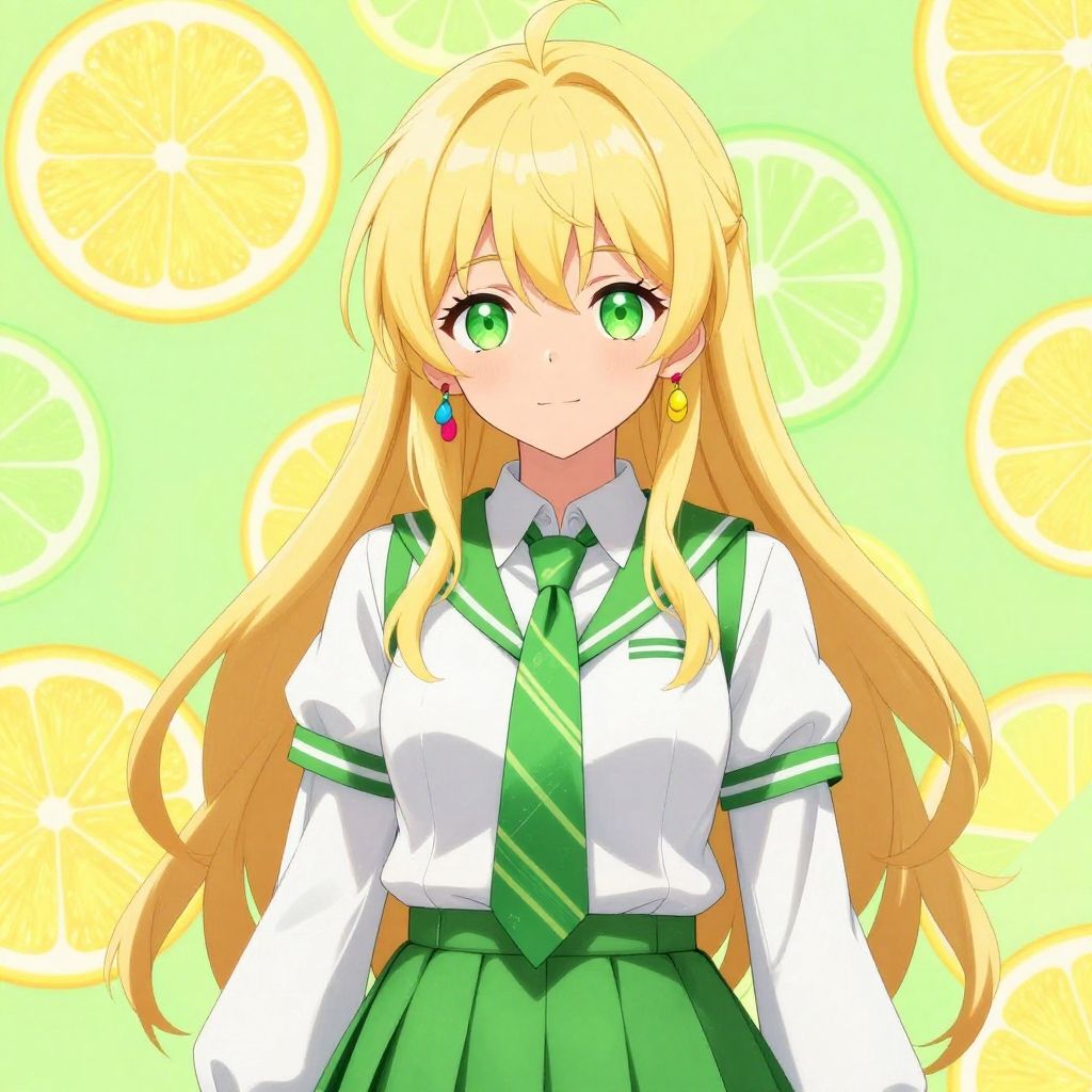 Digital anime-style illustration of a young girl with long blonde hair and bright green eyes wearing a green and white school uniform with a striped tie. She has medium-sized breasts and is accessorized with colorful earrings. The background features a vibrant pattern of yellow and green citrus fruit slices.