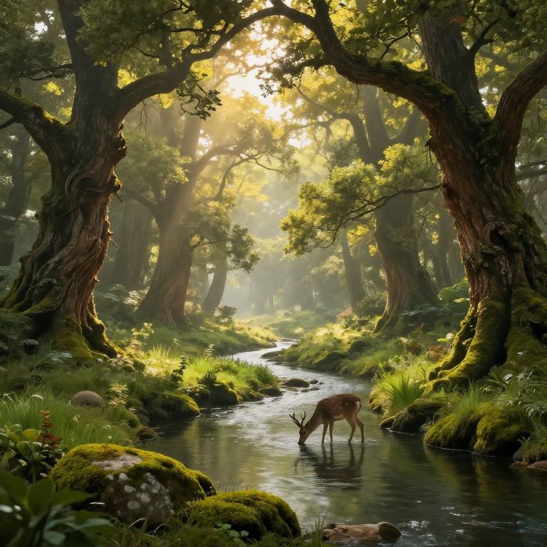 McDougal, a dense ancient forest with towering oaks and moss-covered stones, beams of golden sunlight piercing through mist, a tranquil river winding through vibrant green undergrowth, a lone deer drinking from the water, highly detailed fantasy landscape