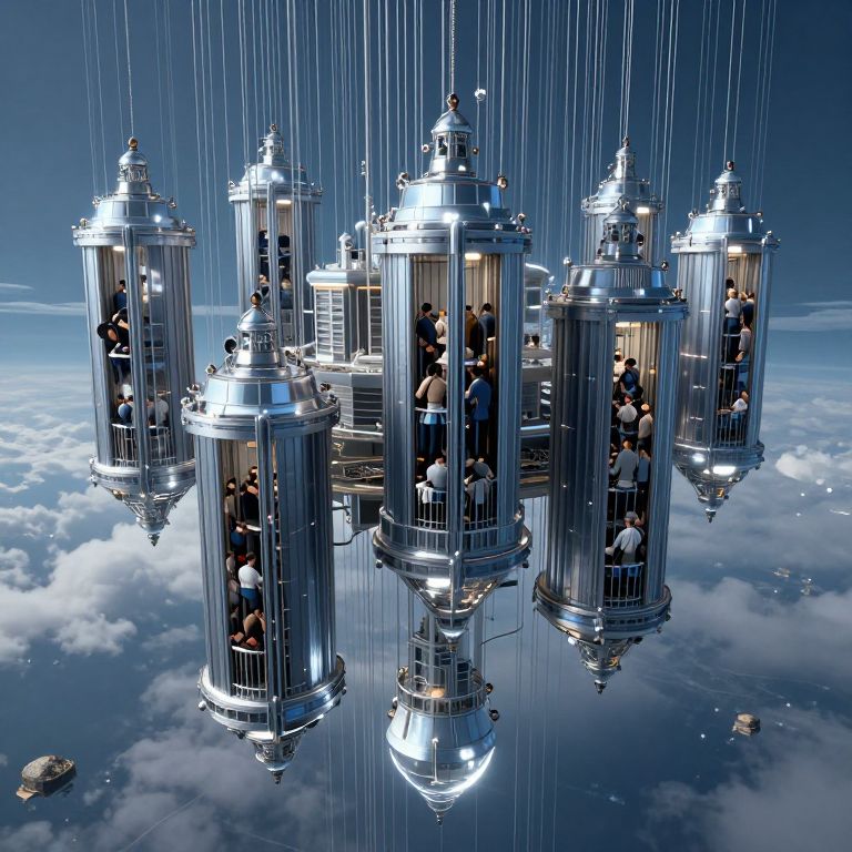 Crowded elevators suspended in the sky form floating cities, connected by cables made of woven moonlight and time.