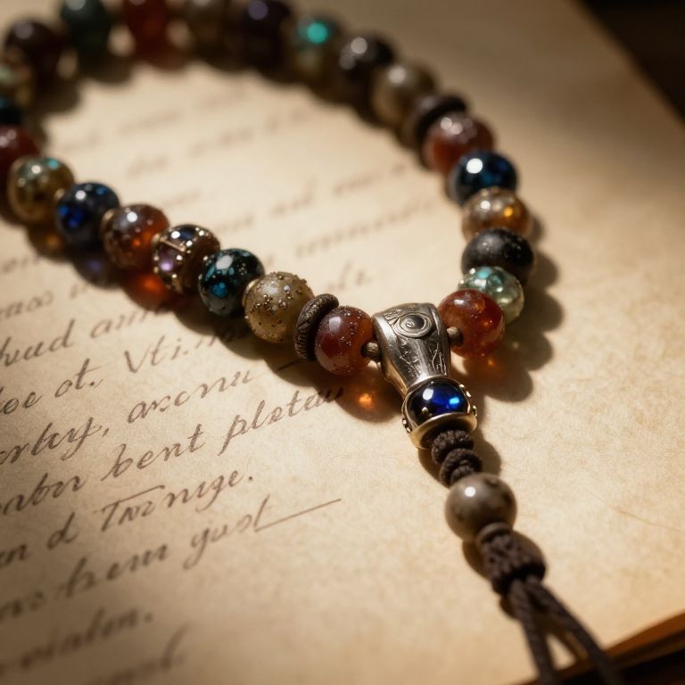 Close-up of a chapelet with colorful gemstones embedded in the beads, resting on ancient parchment with handwritten prayers, dramatic lighting and shadows for a mystical vibe, ultra-detailed macro photography style