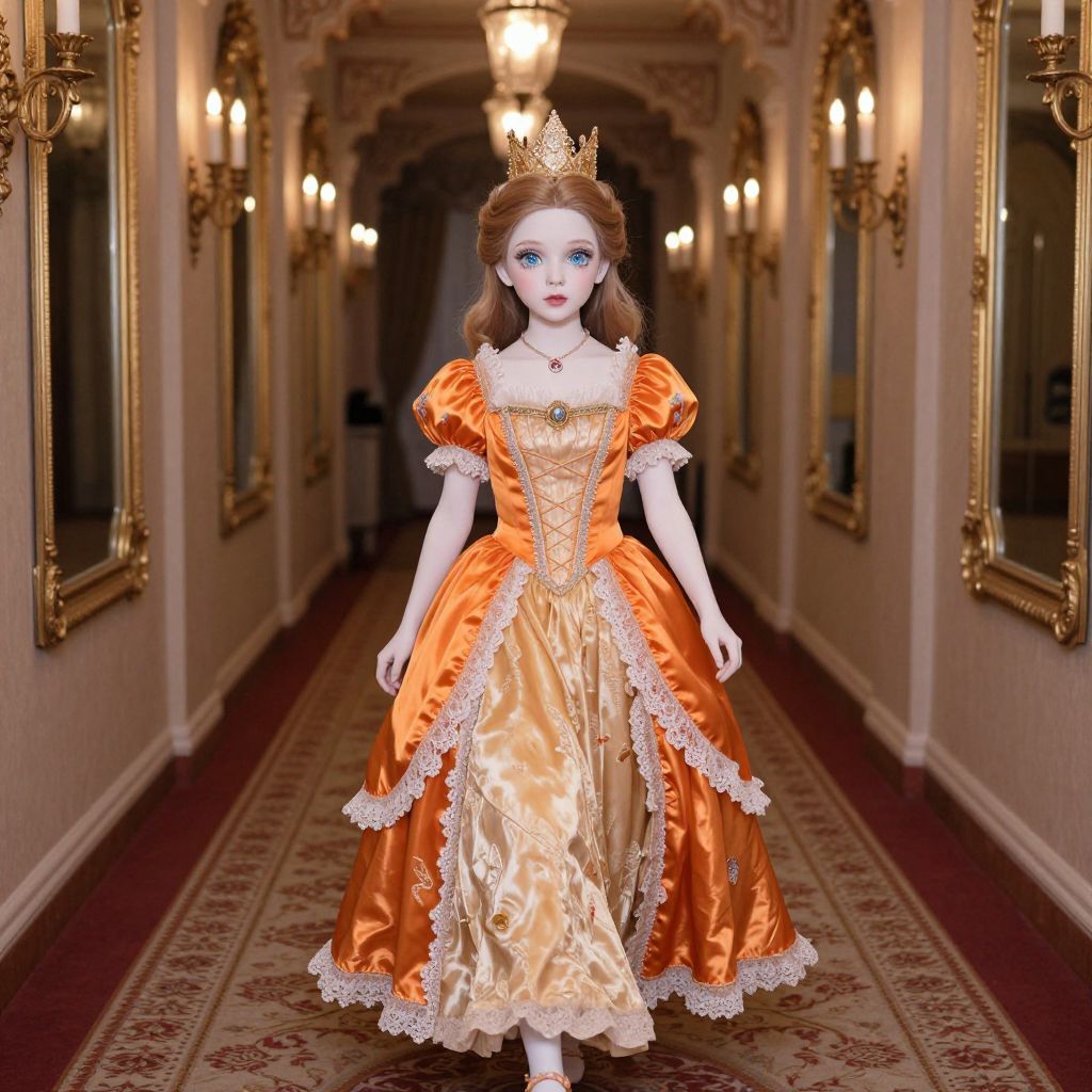 A digital CGI image of a porcelain doll stands in a grand, ornately decorated hallway. The doll, with fair skin and blue eyes, wears a golden crown and an elaborate, floor-length gown. The dress is orange with puffed short sleeves, adorned with white lace trim and a gold brocade bodice. The hallway features red carpet with a patterned runner, cream-colored walls, and gold-framed mirrors, lit by warm, glowing wall sconces. The doll's expression is serene, and the overall style is reminiscent of a princess or royal figure. The image is highly detailed and realistic.