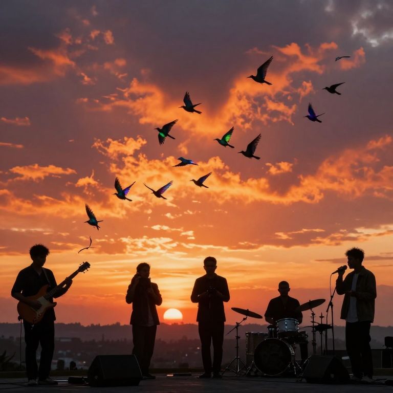 Street musicians stand silhouetted against a vibrant sunset, their melodies conjuring a cascade of iridescent birds that weave through a sky painted with swirling hues of fire and smoke, defying the ordinary boundaries between music, color, and flight.