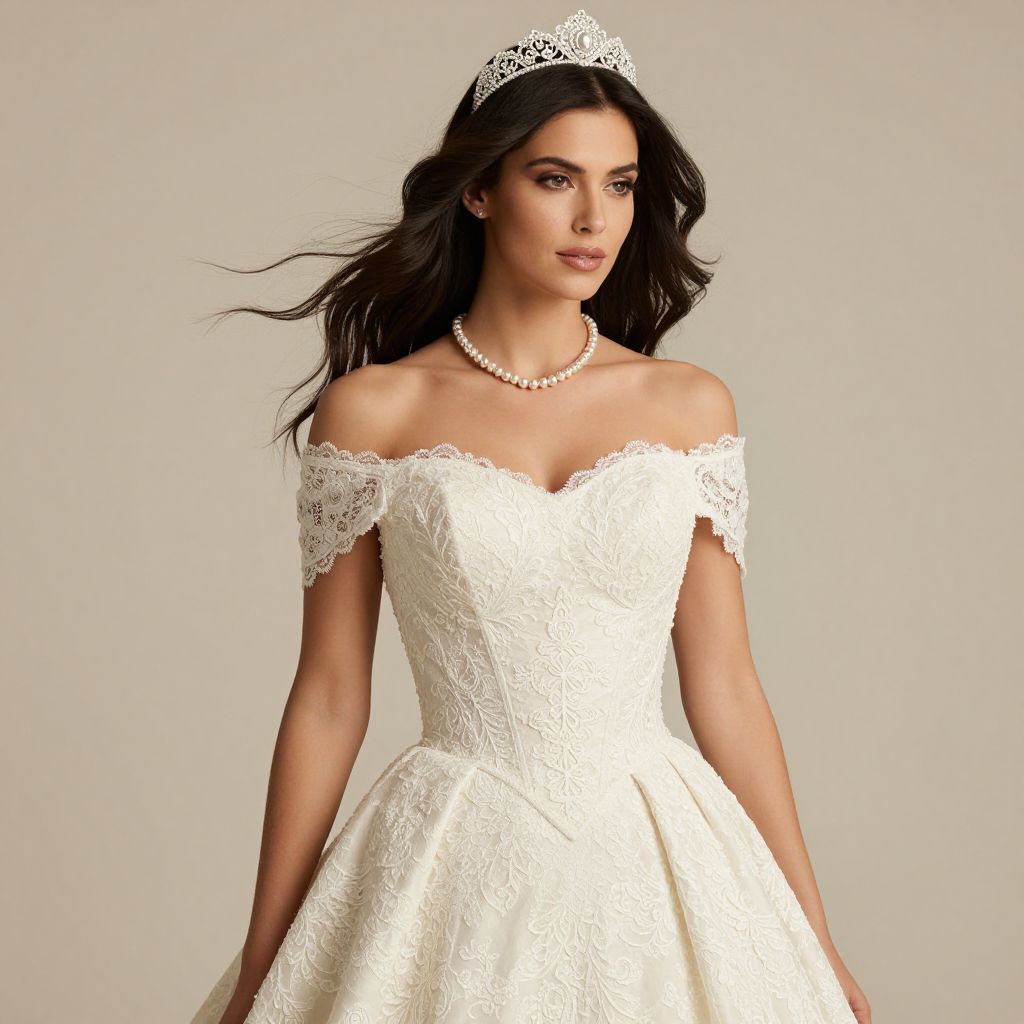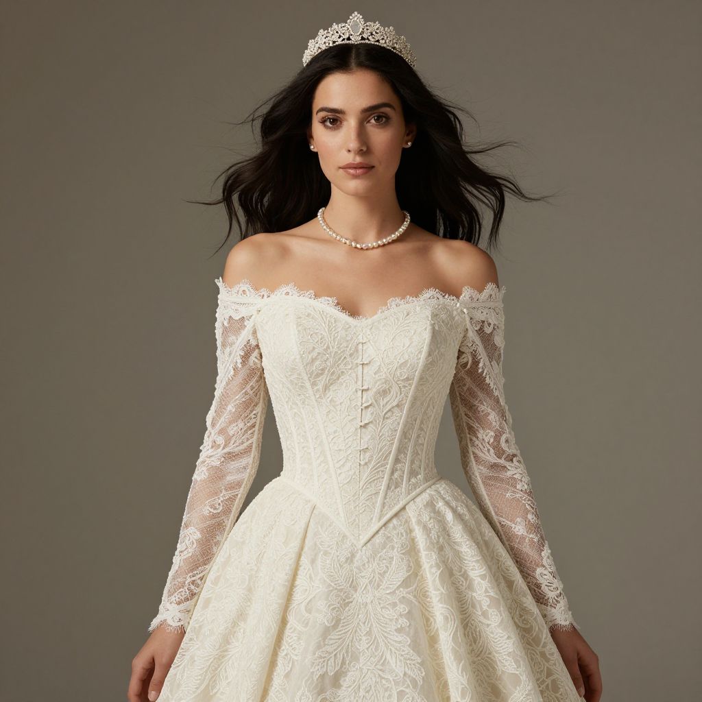 Elegant Renaissance-inspired wedding dress featuring off-the-shoulder sleeves, intricate lace detailing, and a corseted bodice, complemented by a tiara and pearl necklace worn by a woman with flowing dark hair.