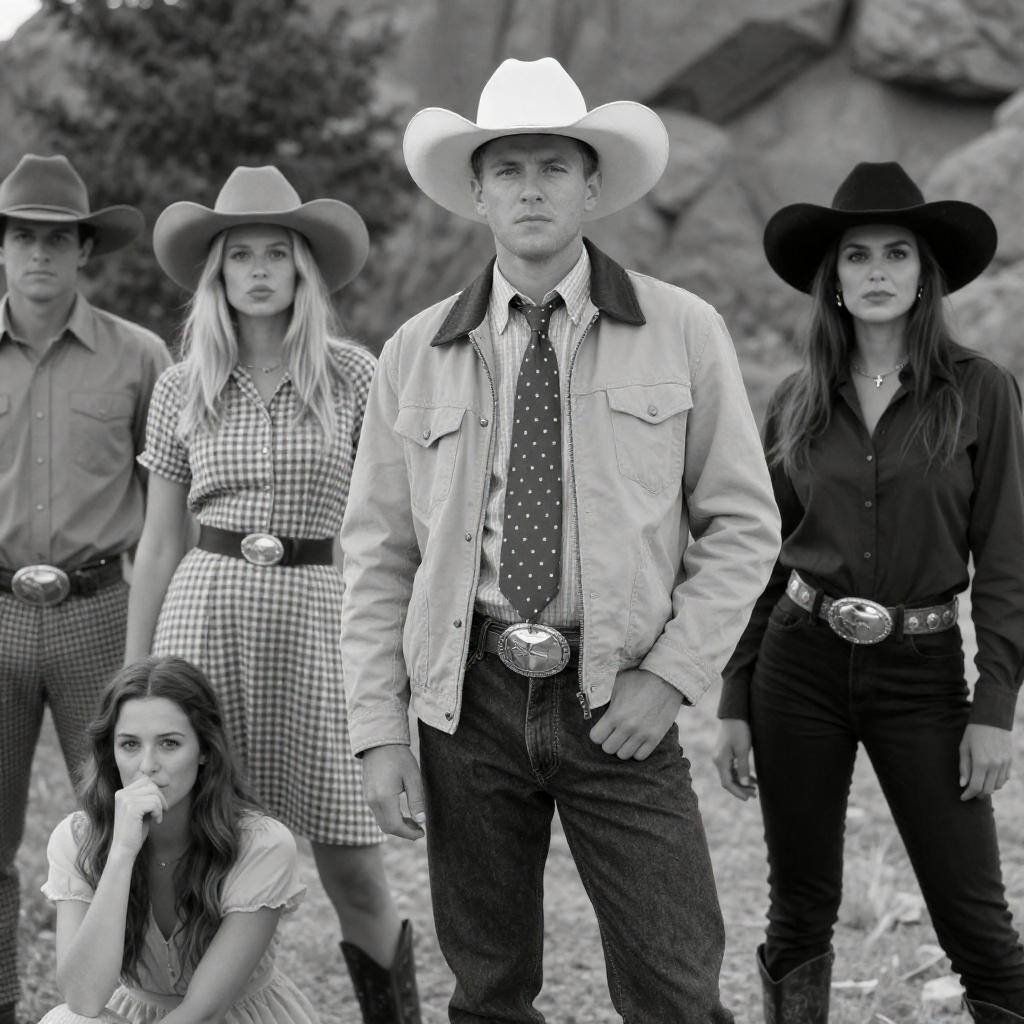 Black-and-white photograph of five people in Western attire. Central male in light jacket, polka-dot tie, cowboy hat, hand in pocket. Female on left in checkered dress and hat, blonde hair, pouty expression. Female on right in dark outfit, large hat, confident expression. Male on far left in checkered pants, hat, partially visible. Female on ground left, light dress, holding hand to mouth. Rocky background, tree in distance.