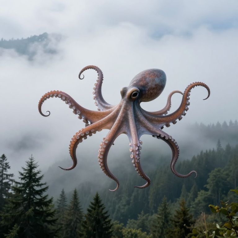 Giant octopus soars gracefully through the misty sky, its translucent tentacles weaving intricate patterns among the clouds above a serene, evergreen forest.