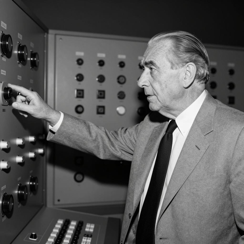 Old man with light skin, slicked-back hair, wearing a light-colored suit, black tie, and white shirt, extends his right arm to point at an intricate machine. Background includes large, detailed control panels with dials and buttons. Black and white, film noir style.