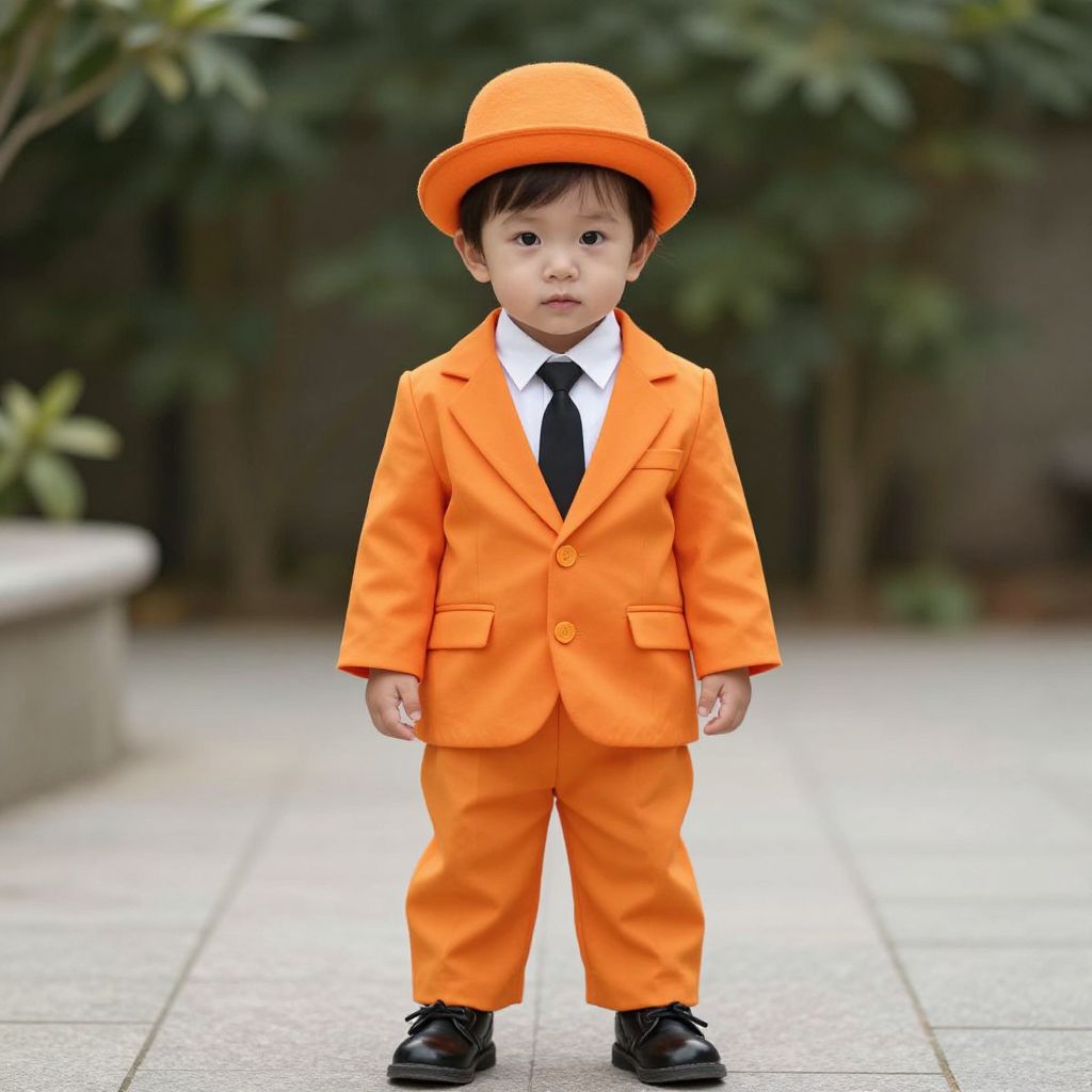 Toddler in Orange Tuxedo Costume