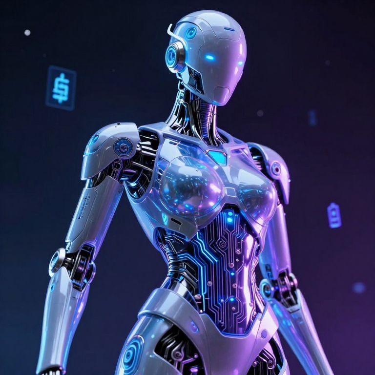 Mal-0 depicted as a sleek sci-fi android, metallic surfaces glowing with blue and purple hues, intricate circuitry patterns visible beneath transparent panels, set against a dark, starry background with floating digital symbols