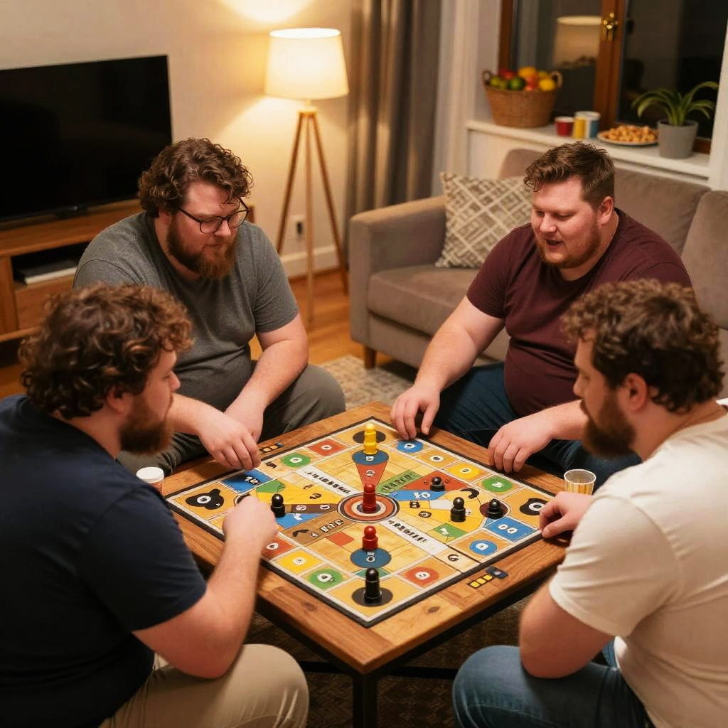 Four fat guys playing a lively board game at a cozy living room, warm lighting, expressive faces, diverse casual outfits, detailed furniture and snacks around, fun and engaging scene