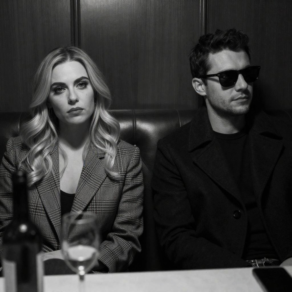 Photograph of a man with short dark hair in a black leather jacket, pinning a woman with blonde hair and a glowing headband upside down on a green chair. Dark, industrial background with dim lighting. Man has intense expression. Woman's face is relaxed. Man's right hand grips woman's head, left hand on her back.