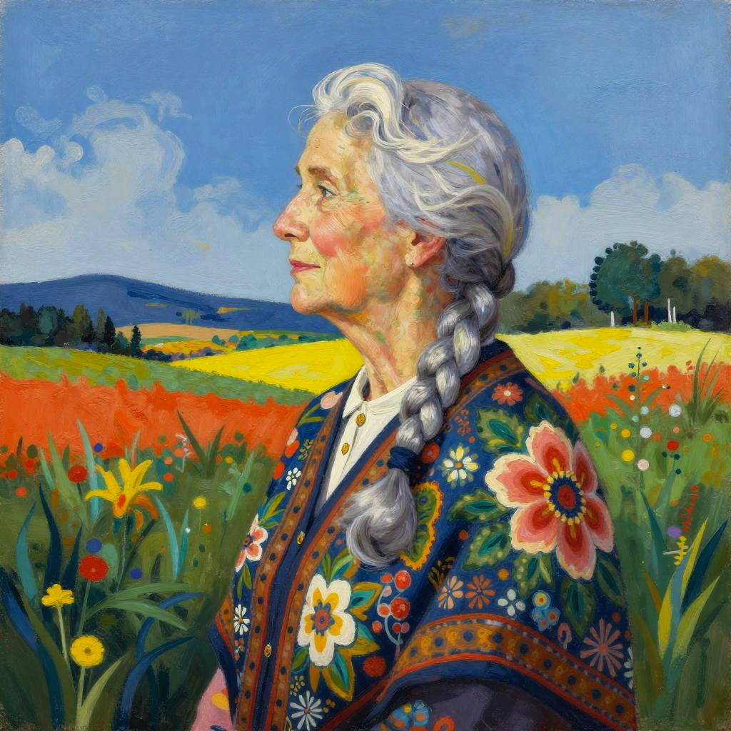 In the style of Georgia O'Keeffe, using gouache: A elderly woman with braided silver hair and ornate floral shawl merged with a vibrant landscape. Their profile creates the illusion of a natural scene, where the patterns of their clothing blend seamlessly into the surroundings.