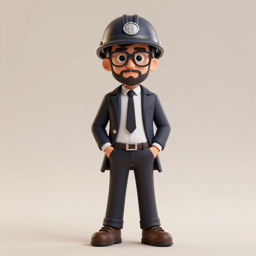 Inspector gadget brain, 1boy, helmet, solo, male focus, glasses, hard hat, hands in pockets, facial hair, full body, pants, brown footwear, jacket, simple background, standing, beard