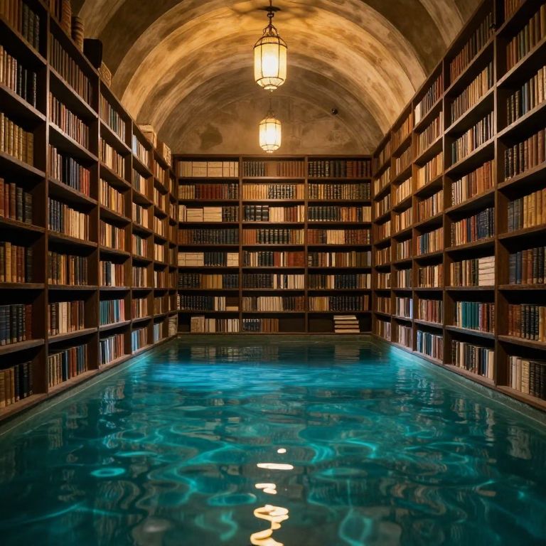 Ancient bookshelves stand solemnly as their lower shelves are submerged beneath a shimmering, turquoise pool of water, reflecting the arched ceiling and warm glow of lanterns above, transforming the library into a surreal, aquatic realm of knowledge.