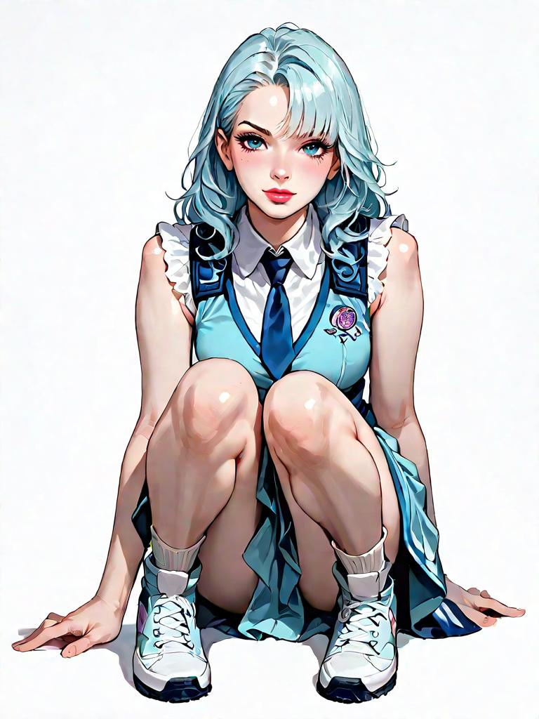 1girl, source_comics, realistic face, full body shot, Woman, casual summer style, ribbed gray tank top, scoop neckline, pale pink pleated miniskirt, blue beaded tote bag, white background.