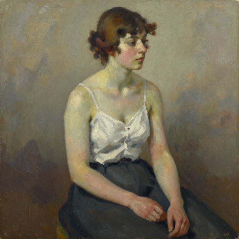 This is a digital reproduction of a traditional oil painting depicting a young woman with fair skin and curly brown hair, sitting against a muted, textured background of gray and beige. She wears a white, slightly translucent camisole with thin straps and a black, high-waisted skirt. Her left arm rests on her knee, and her right hand is relaxed by her side. The lighting creates soft shadows, emphasizing her serene, contemplative expression. The painting style is realistic with subtle, impressionistic brushstrokes, capturing the gentle, natural light and the woman's calm, introspective demeanor.