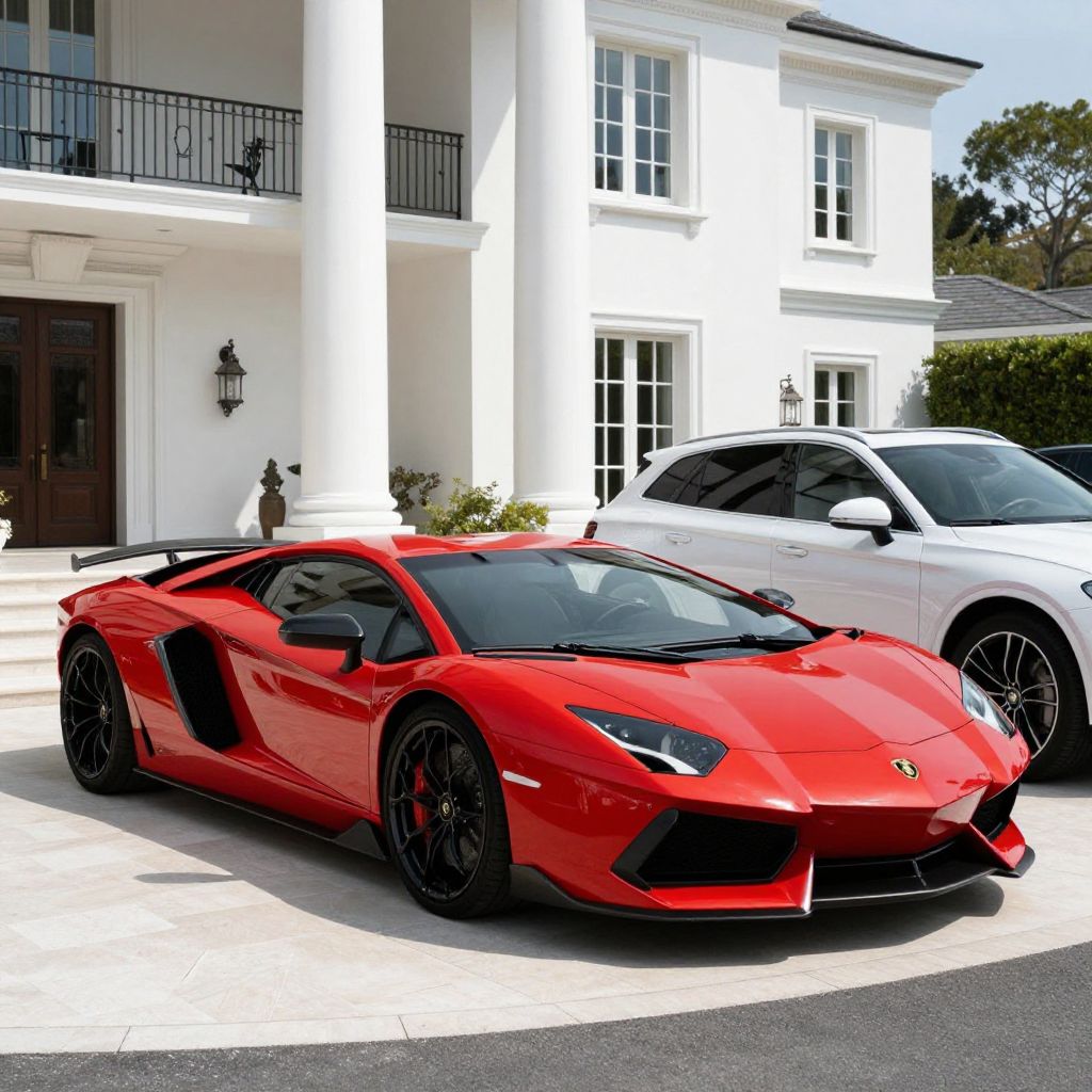 Vibrant red Lamborghini Aventador luxury sports car gleaming under sunlight, parked prominently in front of a grand white mansion with tall columns and elegant windows, while a sleek white SUV and another vehicle are positioned behind it.