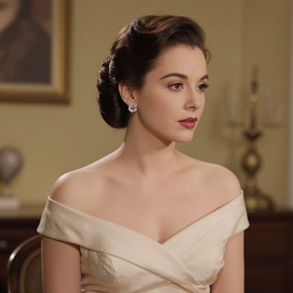 Elegant woman in a 1950s Dior-inspired off-the-shoulder gown, accentuated by a sleek updo hairstyle and sparkling diamond earrings, exudes timeless allure against a softly lit, vintage interior backdrop.