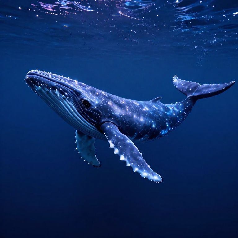 A luminous whale adorned with sparkling stardust glides serenely through a cosmic ocean, its form defying the boundaries between sea and sky.