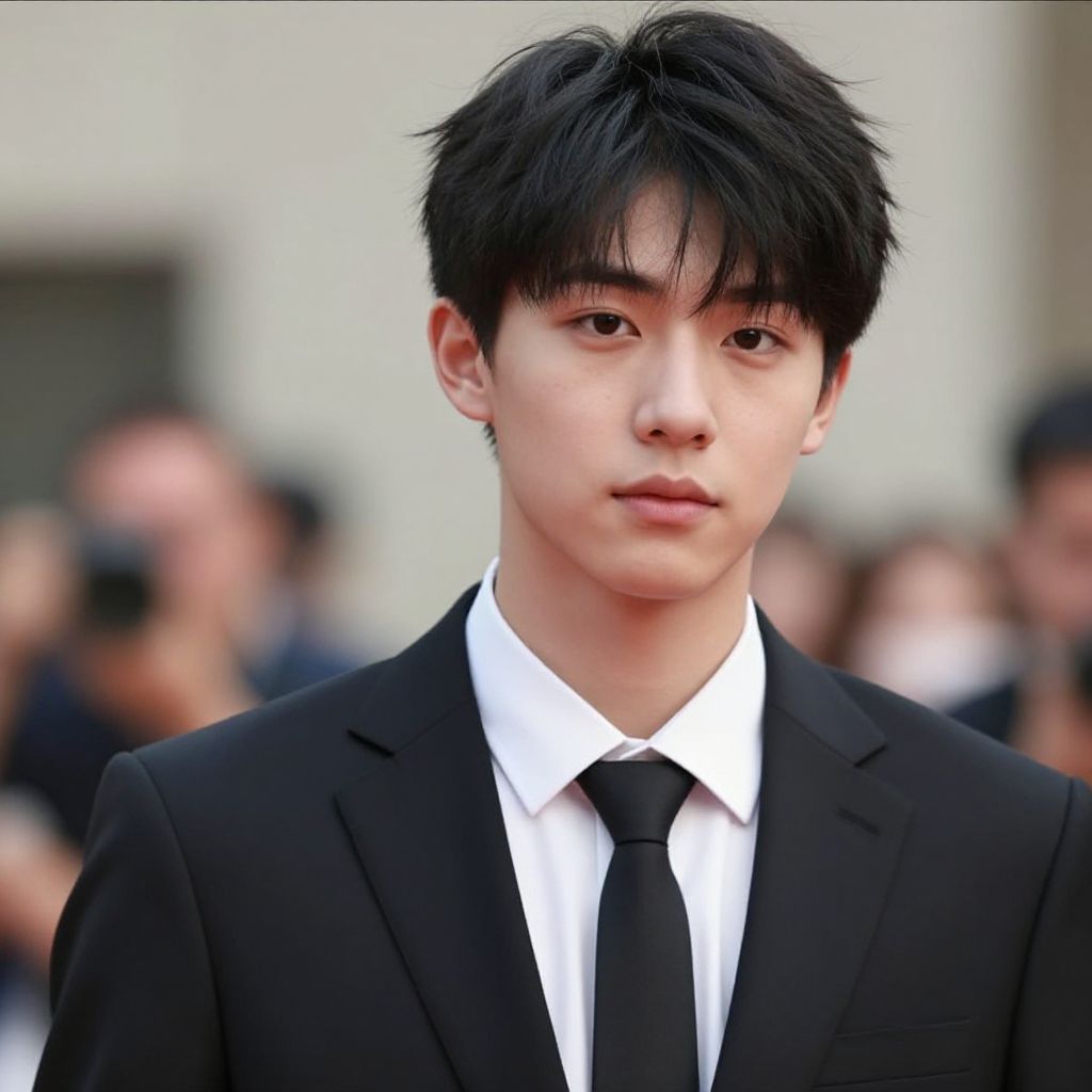 Photograph of a young Asian man with short, black, slightly tousled hair and fair skin, wearing a black suit, white dress shirt, and black tie. He has a neutral expression and is centered in the image. The background is blurred, showing indistinct figures and a greyish wall, suggesting an outdoor event with photographers in the background. The lighting is natural, and the overall color palette is muted with the black suit contrasting against the white shirt. The man's face is slightly angled, and his eyes are looking forward.