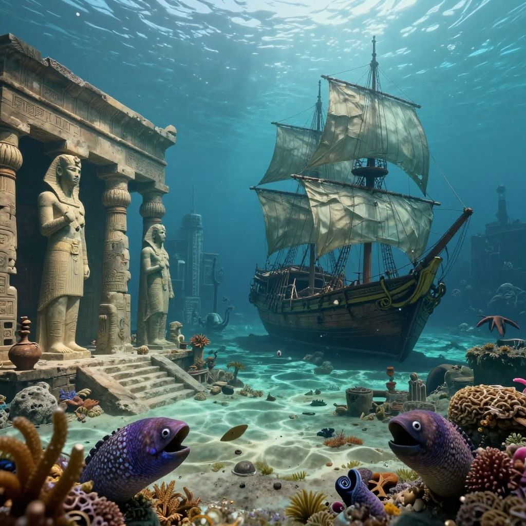 Score_9, score_8_up, score_7_up, score_6_up, score_5_up, score_4_up, photorealistic, amazing_quality, ultra_realistic, 3D, HD, best_quality, very_aesthetic, absurdres, (underwater:2.5), (large city:1.5), abandoned, (egyptian ruins:1.8), (statues:1.2), (moray eel:1.5), (spooky:1.9), (old 3 mast sailboat sink:1.2), ultra high quality landscape, ultra high quality backdrop