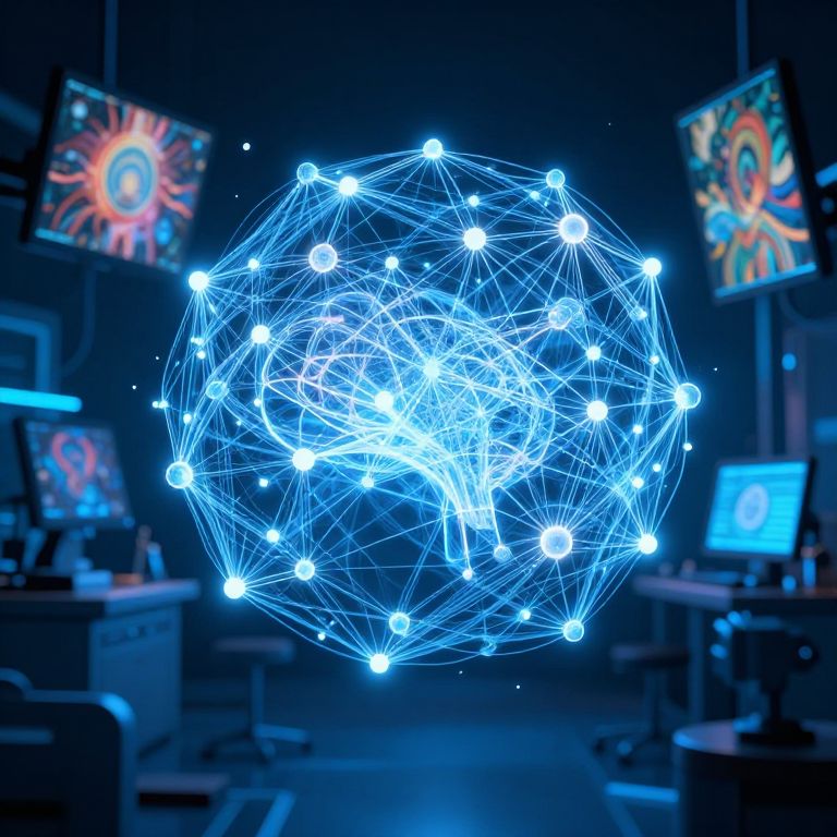 Image generater AI depicted as an advanced neural network portrayed through a complex web of glowing nodes and connections, generating surreal artistic images on multiple screens, surrounded by a high-tech laboratory with ambient blue lighting.