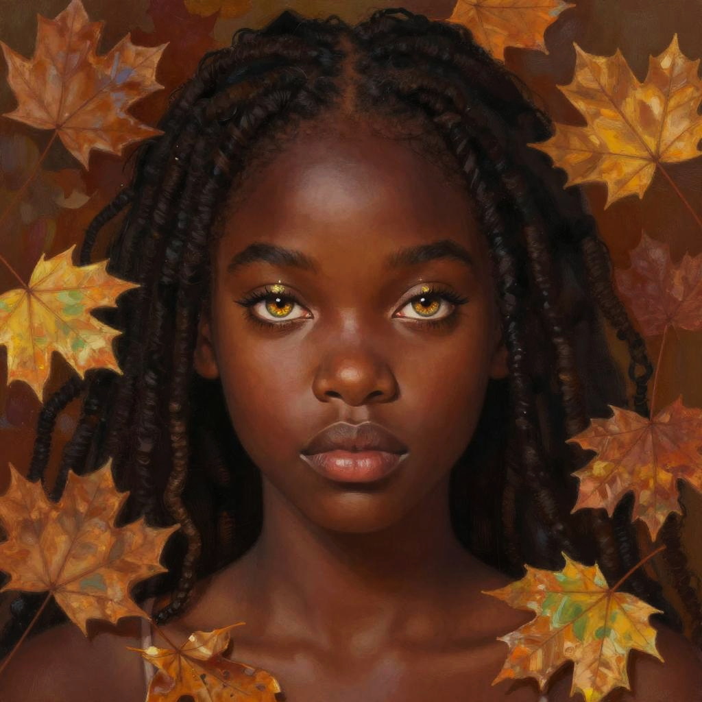 Black girl with striking hazel eyes, depicted in an artistic digital painting style, surrounded by swirling autumn leaves and warm earthy tones, her eyes shimmering with flecks of gold and green, conveying a mood of quiet introspection and natural beauty.