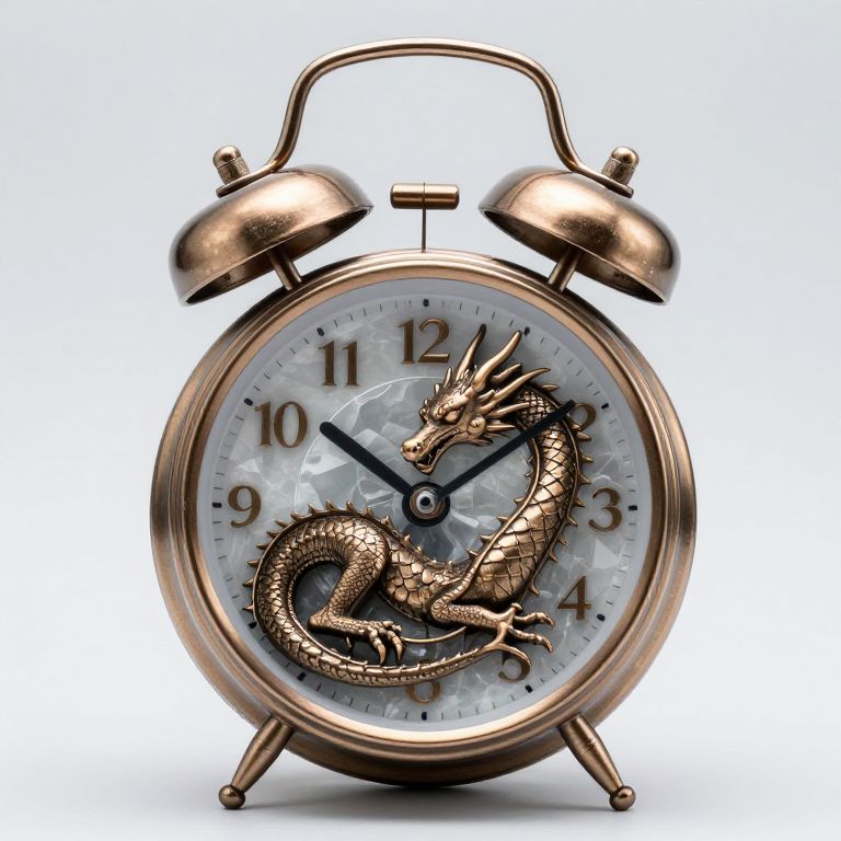 A bronze dragon sleeps inside a crystalline alarm clock, snoring in harmonic intervals.
