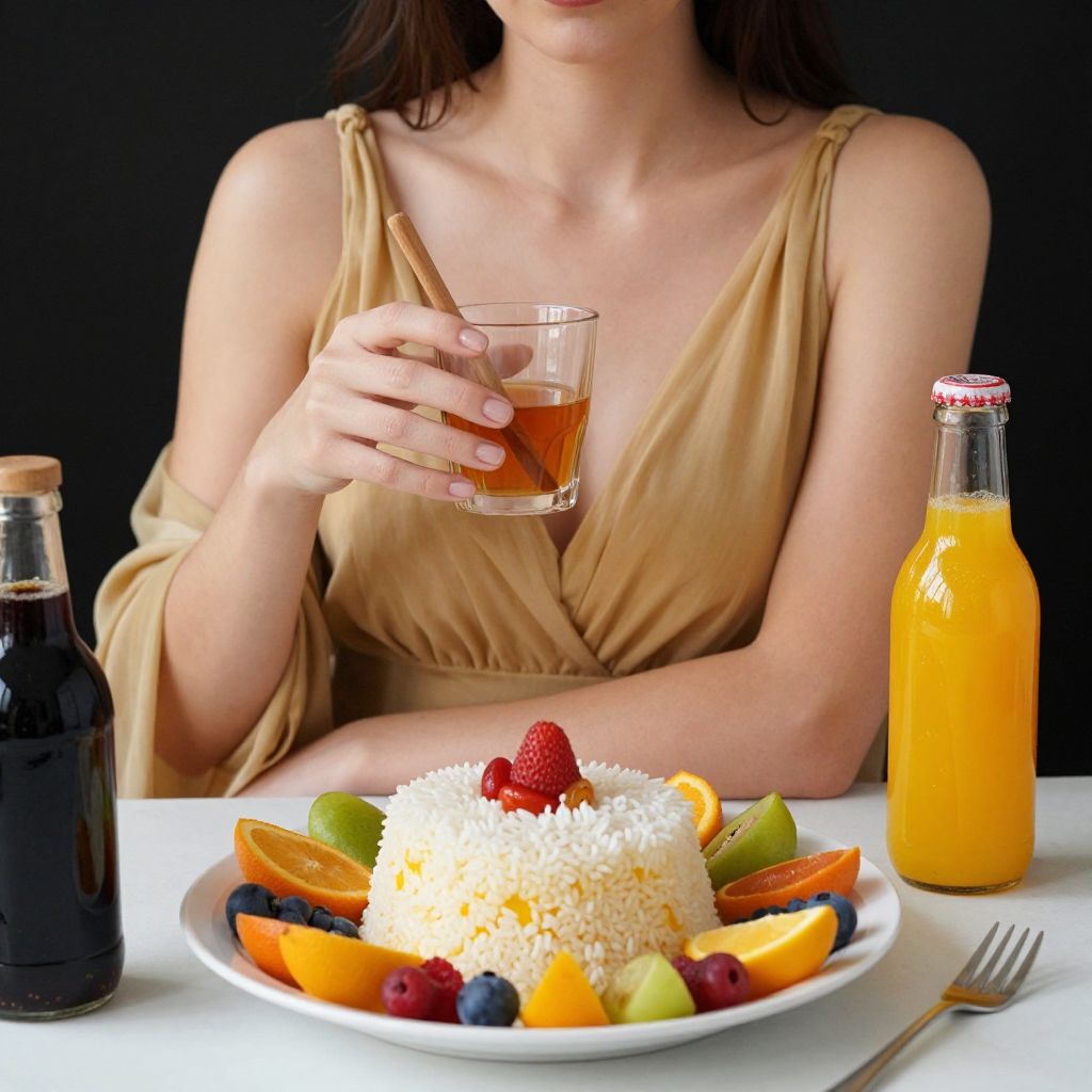 Woman in a golden gown sits gracefully at a table, holding a glass of amber liquid with a wooden stirrer, while a vibrant plate of food featuring a cake topped with rice and surrounded by colorful fruits rests before her, alongside a bottle of orange juice and another dark bottle, all set against a dark backdrop.