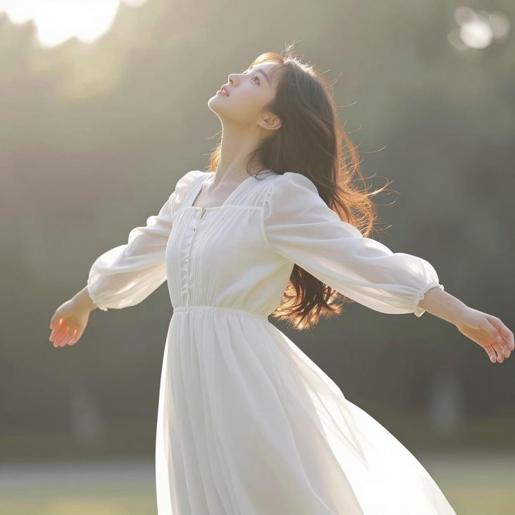 Woman with brown hair in a bun, wearing a white, sleeveless, layered dress, green shoulder bag, stands with hands on a window sill, facing outside. Floral curtains, framed pictures, and bookshelf on the left. Bright sunlight through window.
