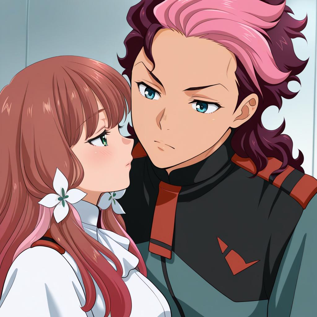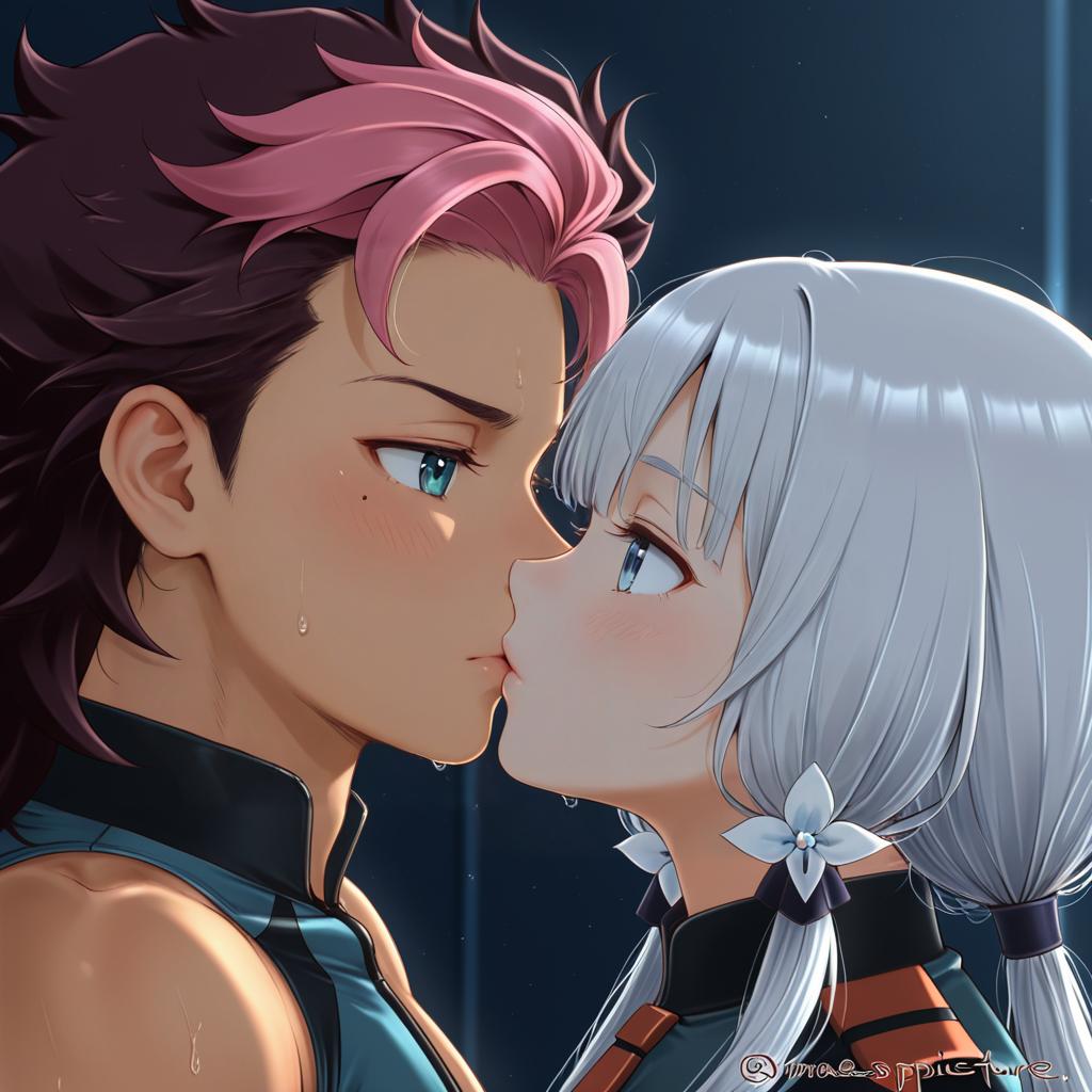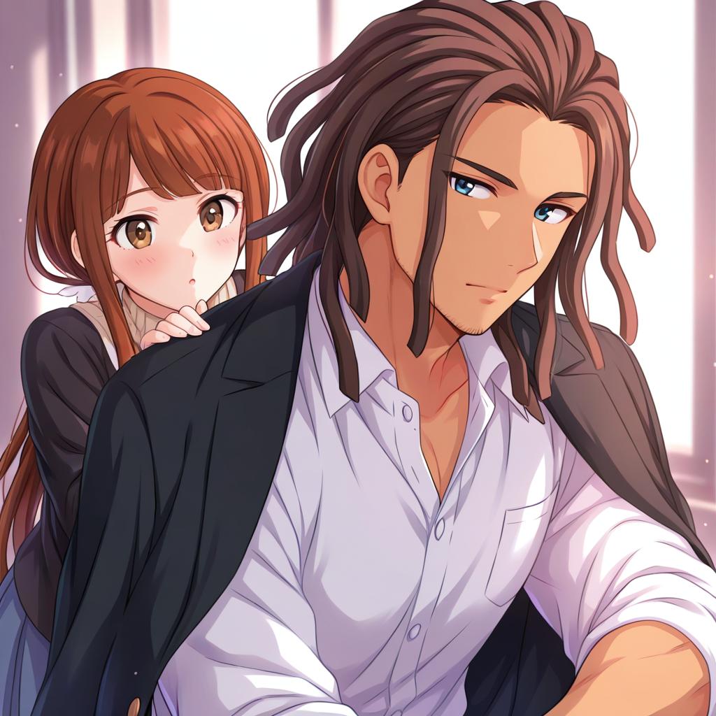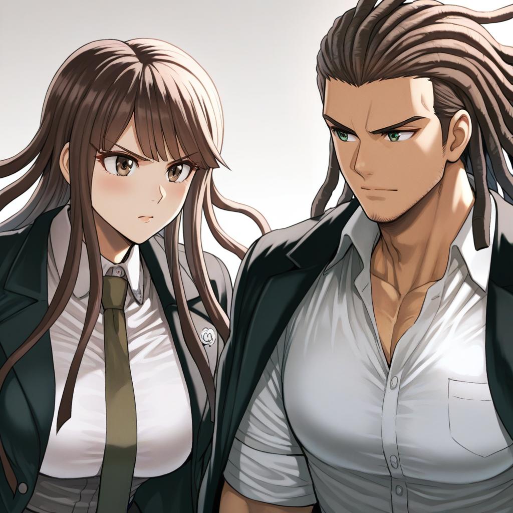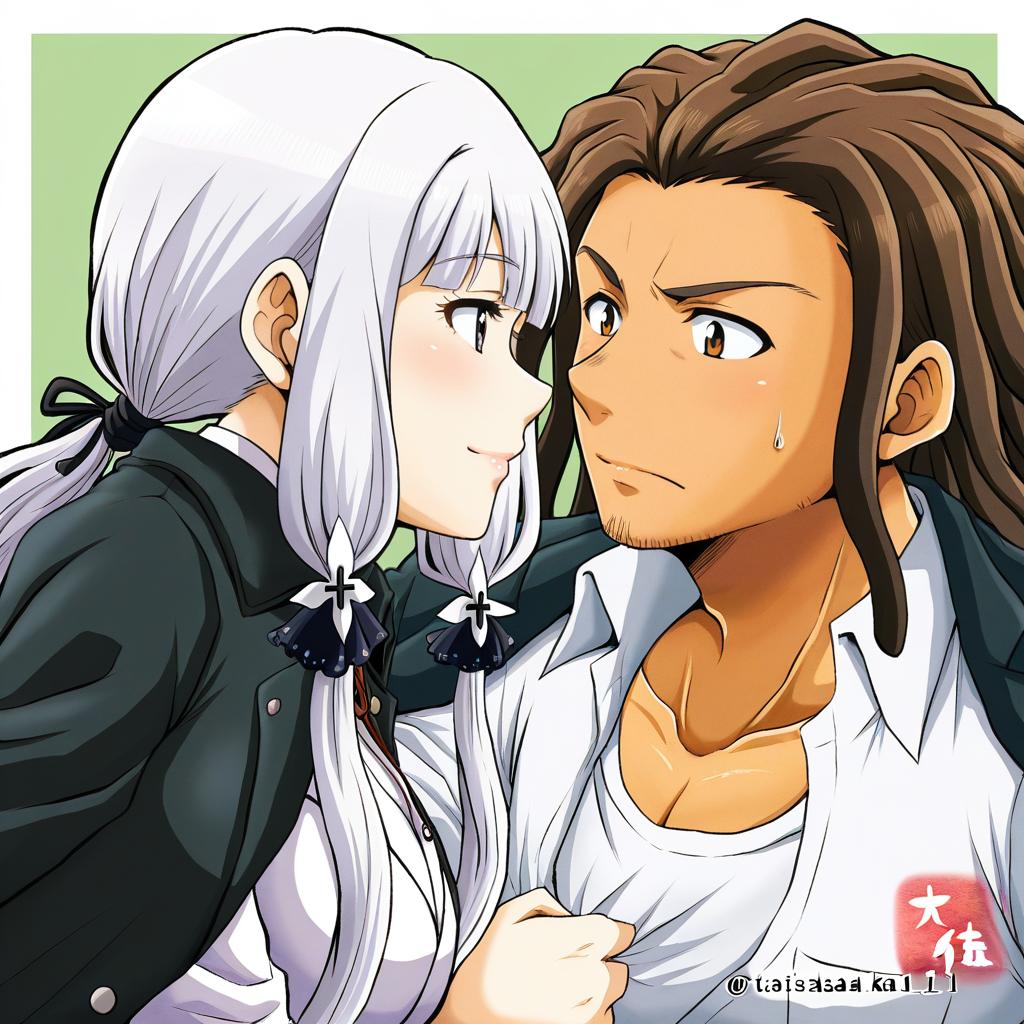 Detailed anime-style illustration featuring two characters from the Danganronpa series. A white-haired female character with long hair tied with black cross-adorned ribbons and a black jacket leans closely toward a muscular brown-haired male character with dreadlocks, stubble, and brown eyes wearing an open white collared shirt with a black jacket over his shoulders. The male character shows a sweat drop indicating tension or nervousness.