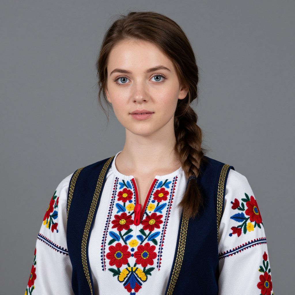 Photograph of a young woman with fair skin and blue eyes, wearing a traditional white blouse with intricate red, blue, and yellow floral embroidery on the chest and sleeves. She has brown hair in a simple braid, and is dressed in a dark blue vest with gold trim. The background is a plain, neutral gray, keeping the focus on her.