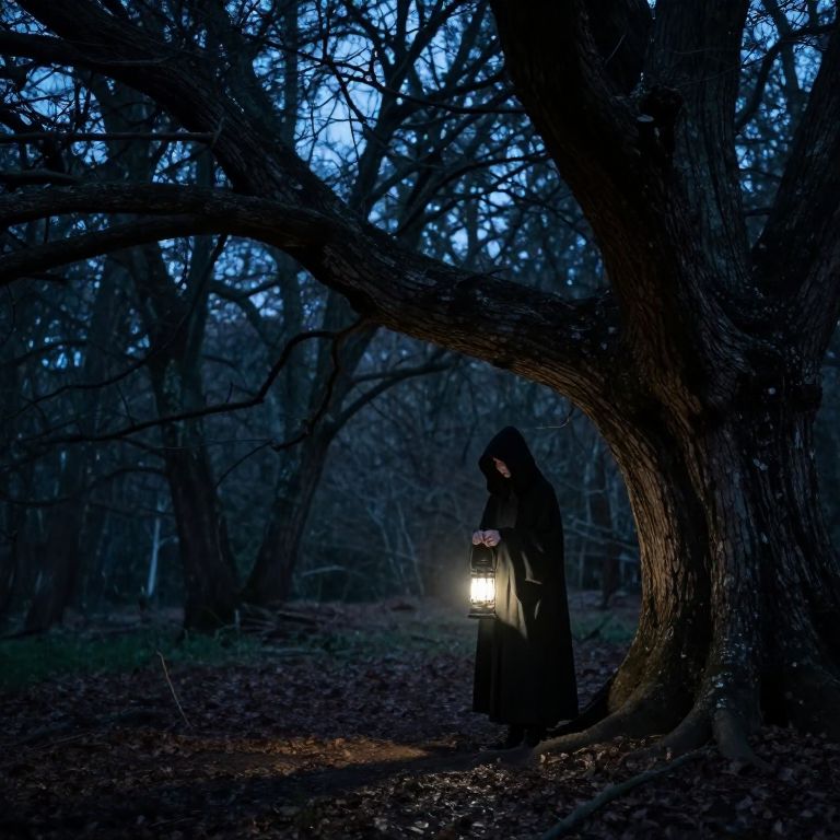 Photograph of a mysterious, hooded figure in a dark, flowing cloak standing under a large, curved tree in a dense, leafless forest at dusk. The figure holds a glowing lantern, casting a soft light on the forest floor. The background is shadowy with blue-tinted light filtering through the tree branches, creating a spooky, ethereal atmosphere. The forest floor is covered in fallen leaves, and the tree's rough bark contrasts with the smooth fabric of the cloak. The overall mood is eerie and mystical, with a strong contrast between light and dark.