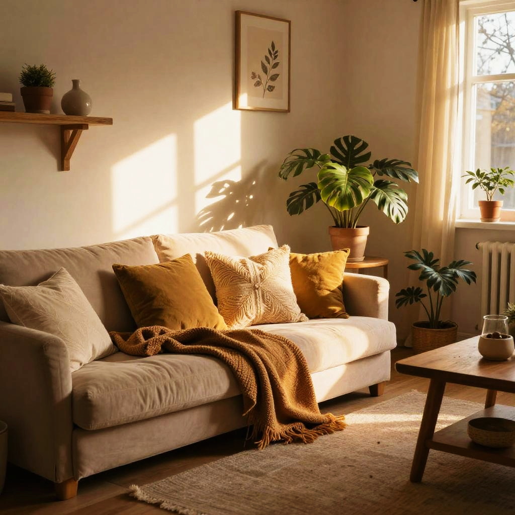 A warmcore-inspired room interior bathed in golden light, filled with plush cushions, rustic wooden furniture, warm textiles, indoor plants, and soft throws, creating a cozy and inviting atmosphere reminiscent of a perfect autumn day.