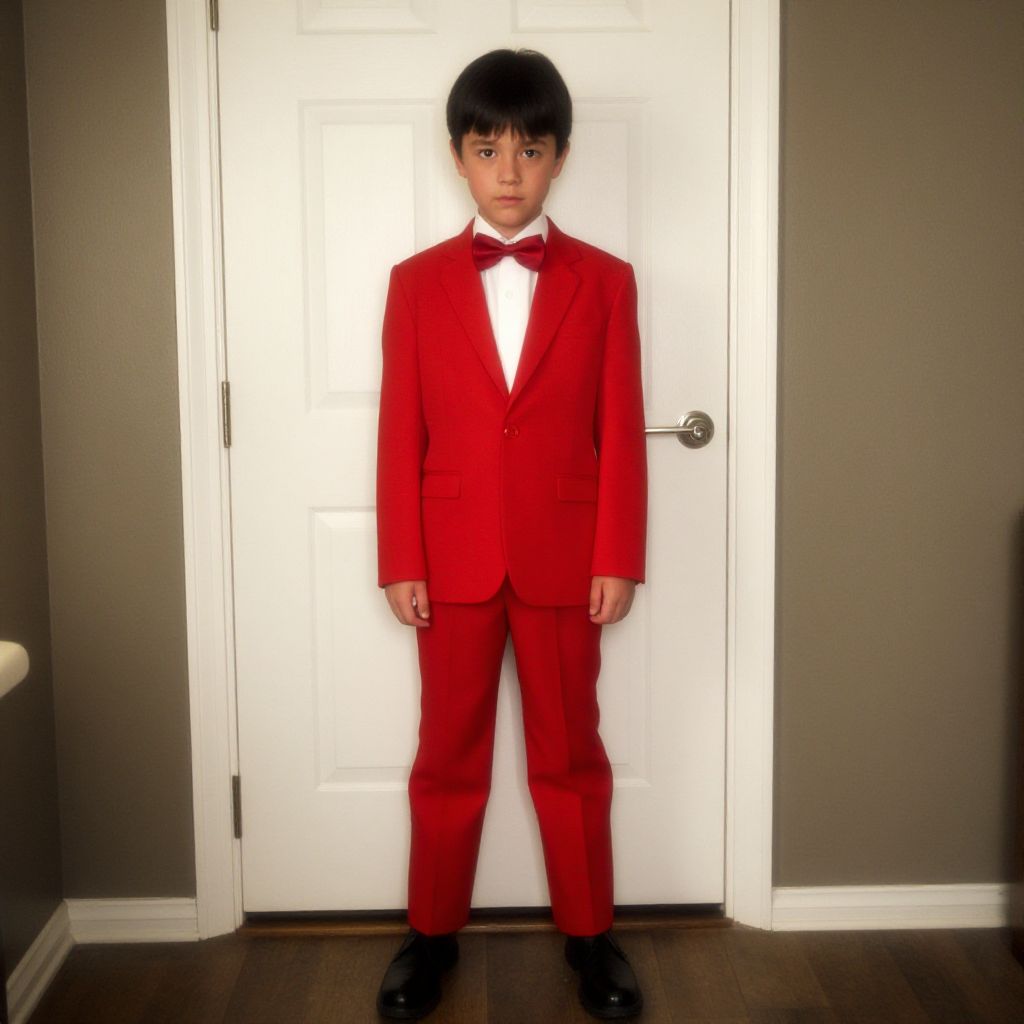 Photograph of a young boy with short black hair, wearing a bright red tuxedo, white shirt, red bow tie, and black shoes,