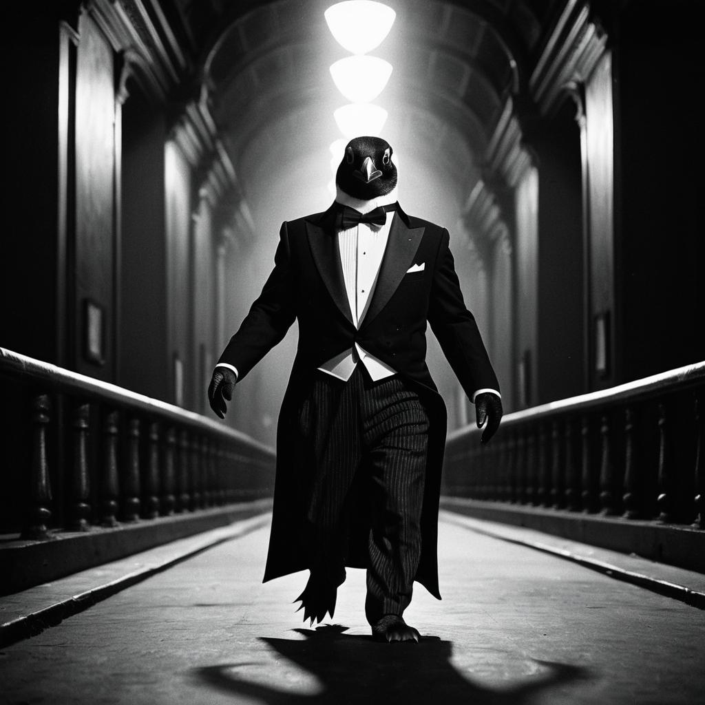 Stylish jazz saxophonist dressed in a dark suit and fedora playing saxophone on a rainy urban street. Noir film style image featuring cinematic lighting, reflections on the wet pavement, and blurred city buildings and pedestrians in the background. Moody and atmospheric street scene blending music and fashion.