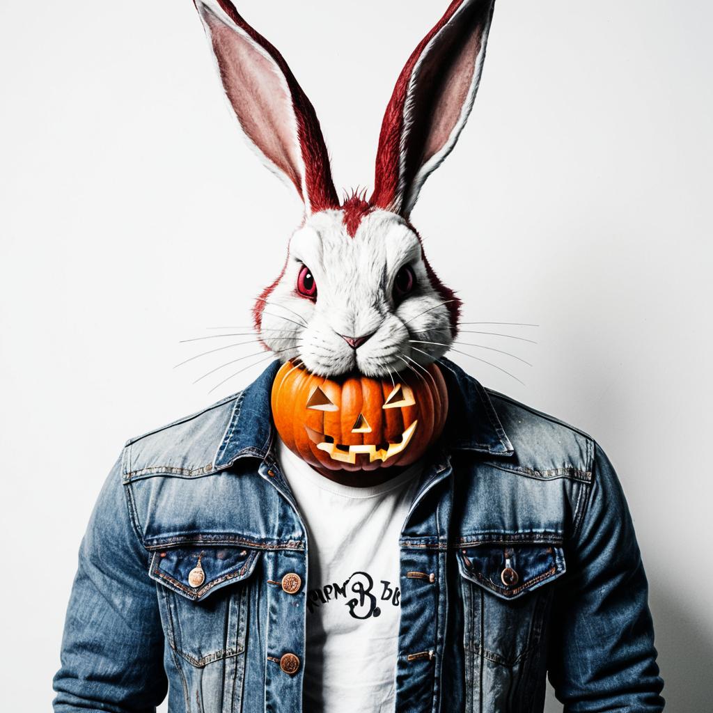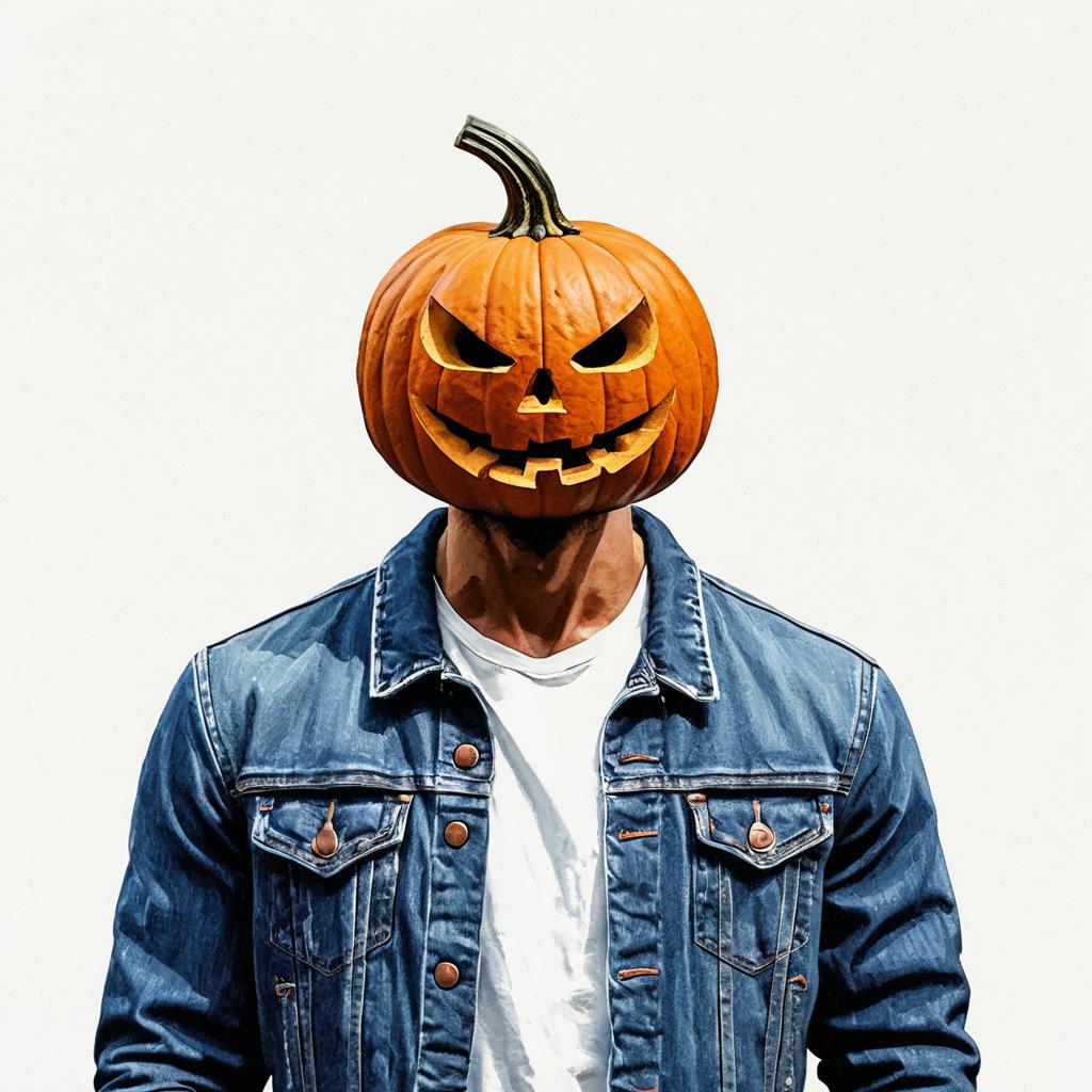 Impressionist style illustration of a muscular man wearing a blue denim jacket and white shirt, with a carved pumpkin as a head, set against a white background. The pumpkin features a classic jack-o'-lantern face with triangular eyes and a jagged mouth.