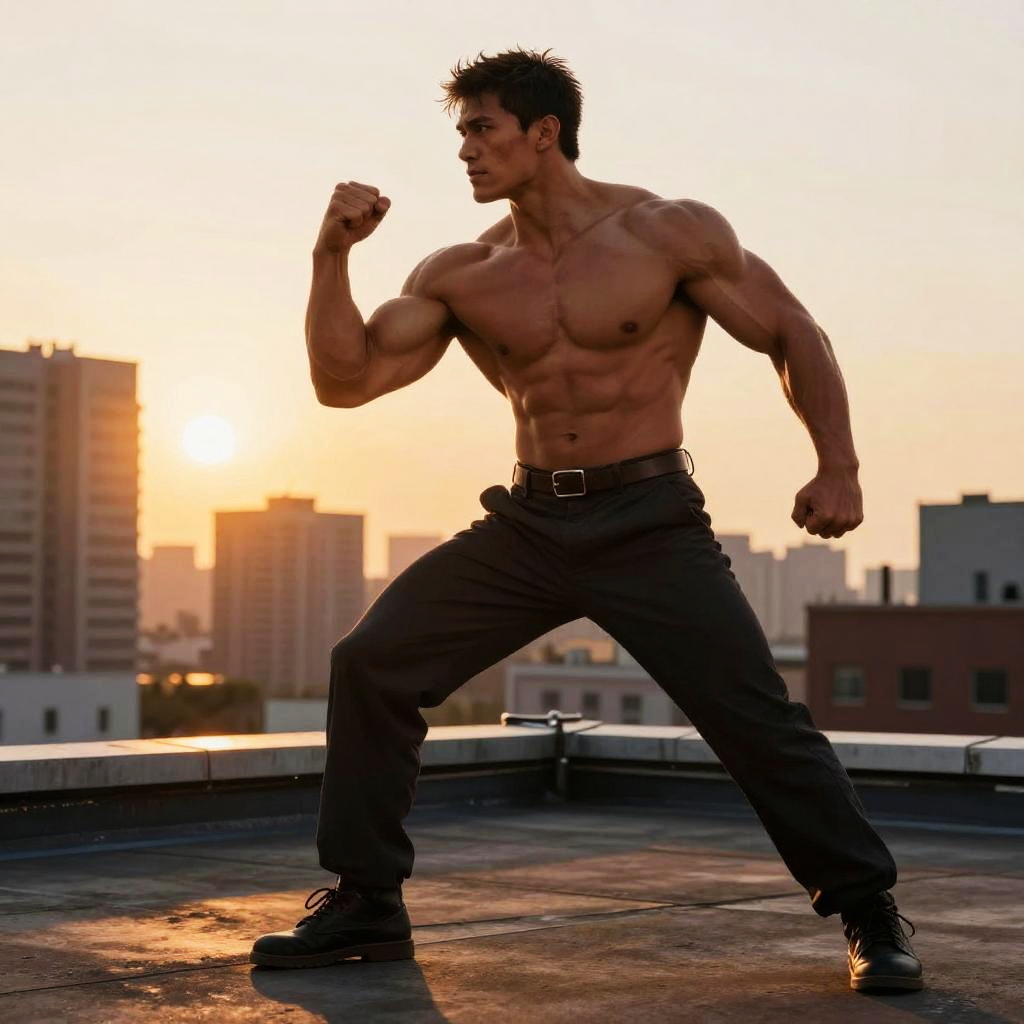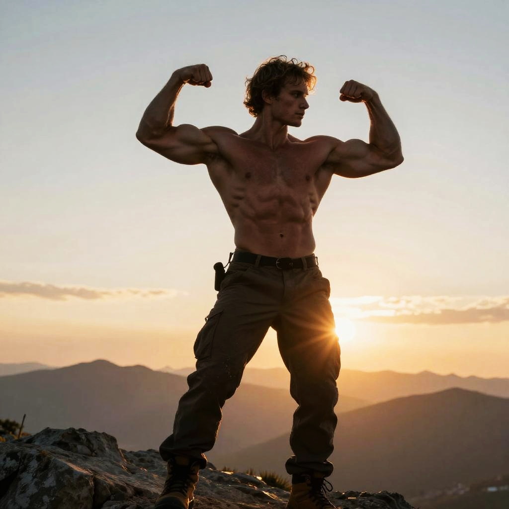 Photograph of a muscular, shirtless man with curly brown hair, flexing his biceps against a sunset backdrop. He stands on a rocky mountain peak, silhouetted by the golden light. He wears dark pants and a belt with a small pouch. The sun is low in the sky, casting a warm glow and creating long shadows. The distant mountains and clear sky add depth to the image. The man's defined abs and strong arms are prominently highlighted by the backlighting. The overall mood is powerful and adventurous.