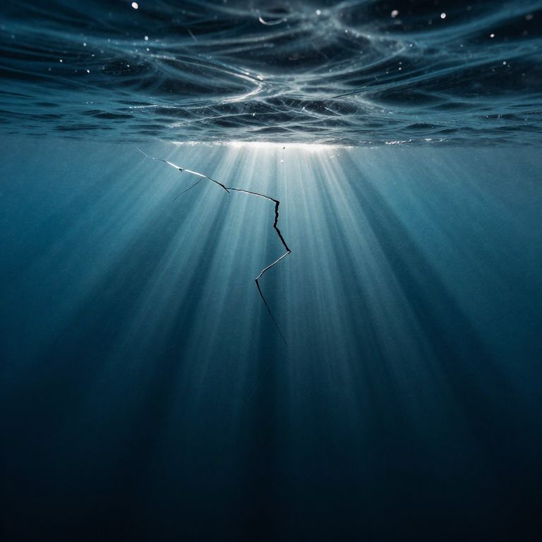 Photograph of an underwater scene featuring a dark blue ocean. Light beams from the surface illuminate the water from above, creating a radiant effect. A jagged, black crack runs vertically through the center, breaking the light's path. The water's surface above is textured with gentle ripples, reflecting light and creating small white highlights. The image captures a sense of depth and mystery, with the crack suggesting a hidden or damaged area beneath the surface. The overall mood is serene yet slightly ominous due to the crack's presence.