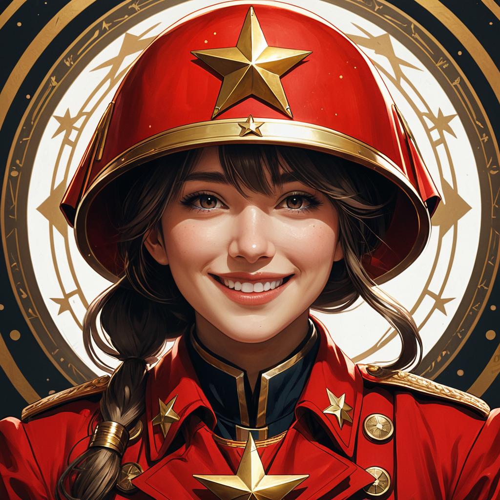 Digital painting portrait of a young Russian woman wearing a traditional 19th century Russian Empire military jacket with intricate gold embroidery and metal shoulder pauldrons. She also wears a matching military hat adorned with a golden double-headed eagle insignia. Set against an architectural background featuring arched windows and columns, the image showcases sharp focus and cinematic lighting, inspired by artists like Artgerm, Greg Rutkowski, and Alphonse Mucha.