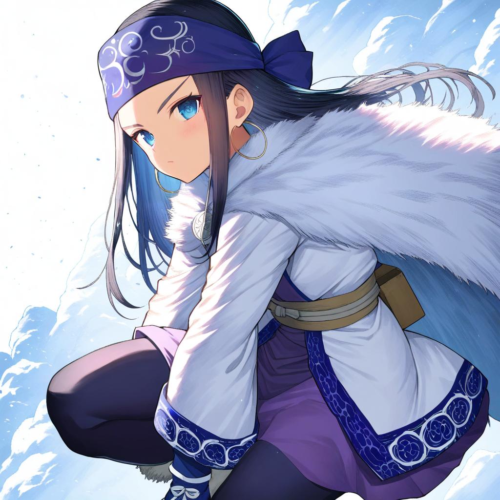 Asirpa, golden kamuy, 1girl, blue eyes, long hair, black hair, ainu clothes, ainu clothes, fur cape, long sleeves, hoop earrings, ainu, blue bandana, headband, by artist b-ginga, animagine