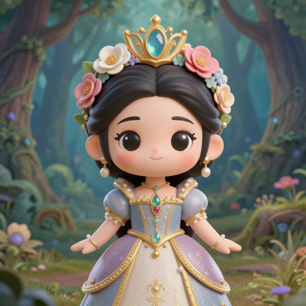 CGI digital illustration of a cute, chibi-style princess with large, expressive brown eyes, fair skin, and dark hair adorned with a golden crown featuring a blue gem and pink, white, and yellow flowers. She wears a lavender and white dress with gold trim, puffed sleeves, and a turquoise gem at the center. Her outfit is complemented by a matching turquoise necklace and earrings. The background is a magical forest with tall trees, colorful flowers, and a soft blue mist. The overall style is whimsical and fantastical, with a focus on bright, vibrant colors and a gentle, enchanting atmosphere.
