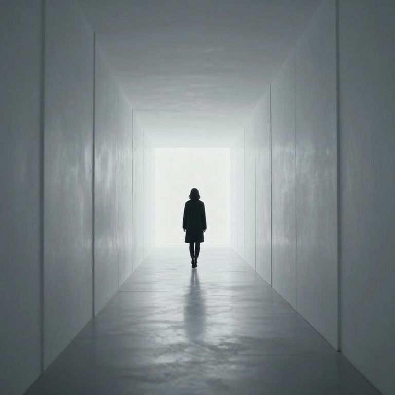 Amidst the sterile corridors of infinite reflection, a solitary figure walks toward an unseen horizon, each step unveiling echoes of parallel lives—a haunting symphony of solitude and existential wonder.