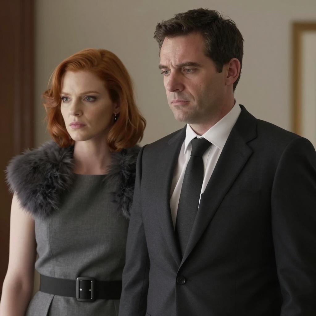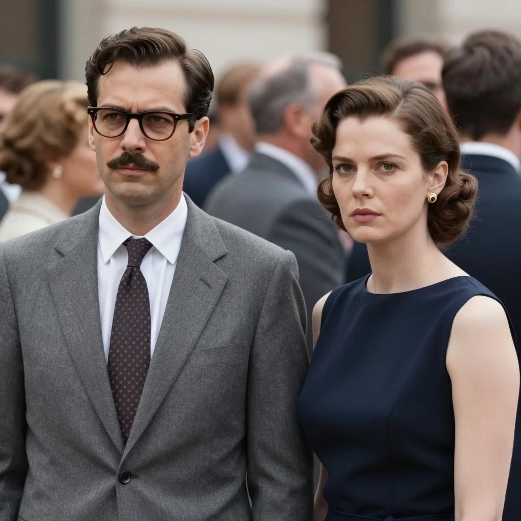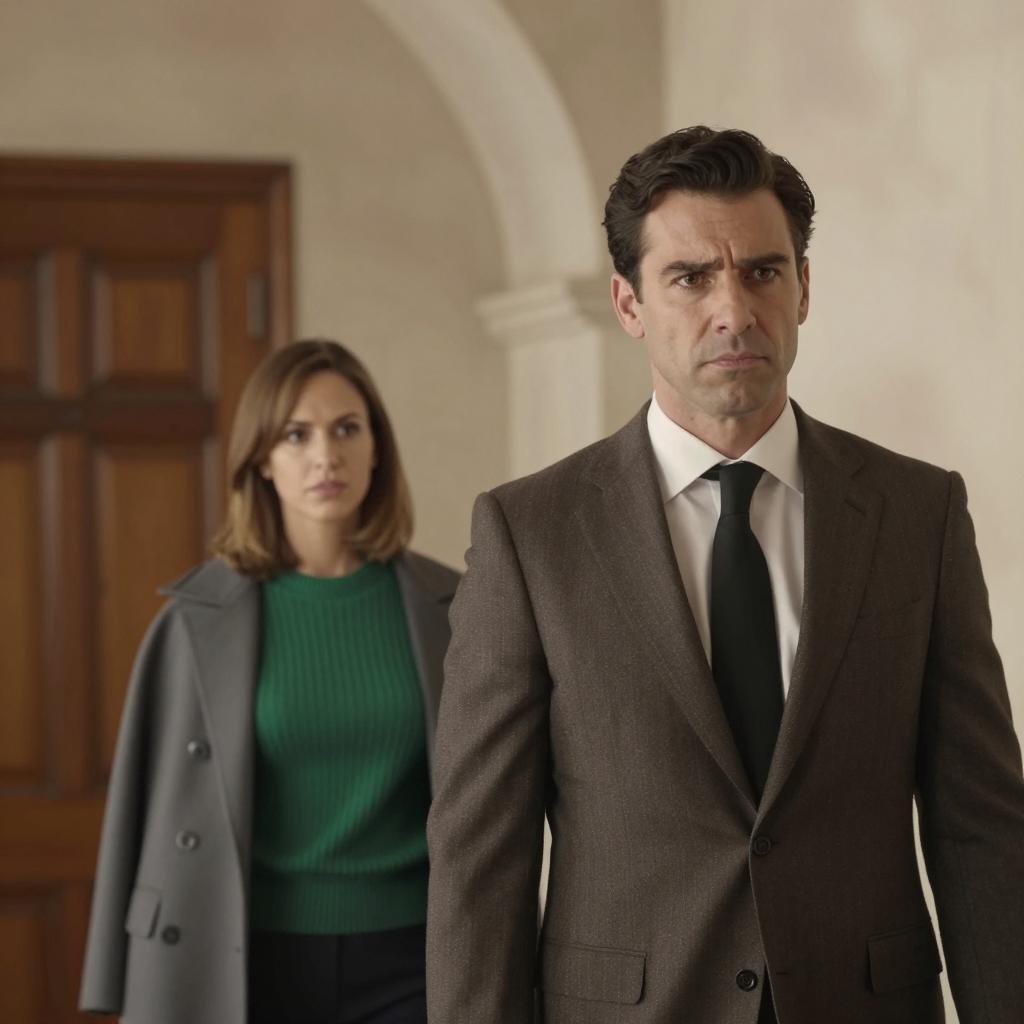 Photograph of a man and woman in a hallway. Man in foreground, right, dark hair, serious expression, brown pinstripe suit, white shirt, black tie. Woman in background, slightly out of focus, light brown hair, green ribbed sweater, gray cape. Wooden door on left, arched stone wall behind. Man's face centered, woman's face to the left, slightly blurred.