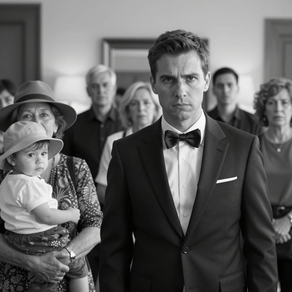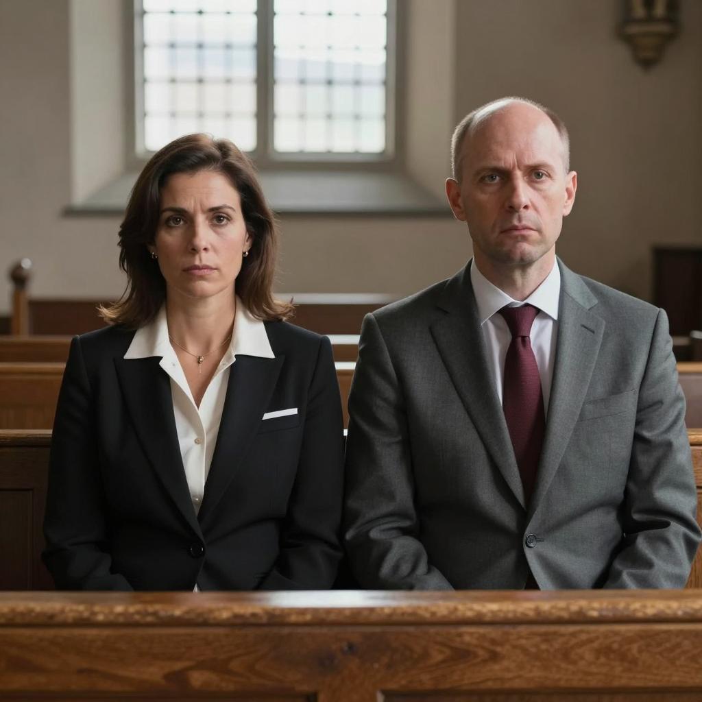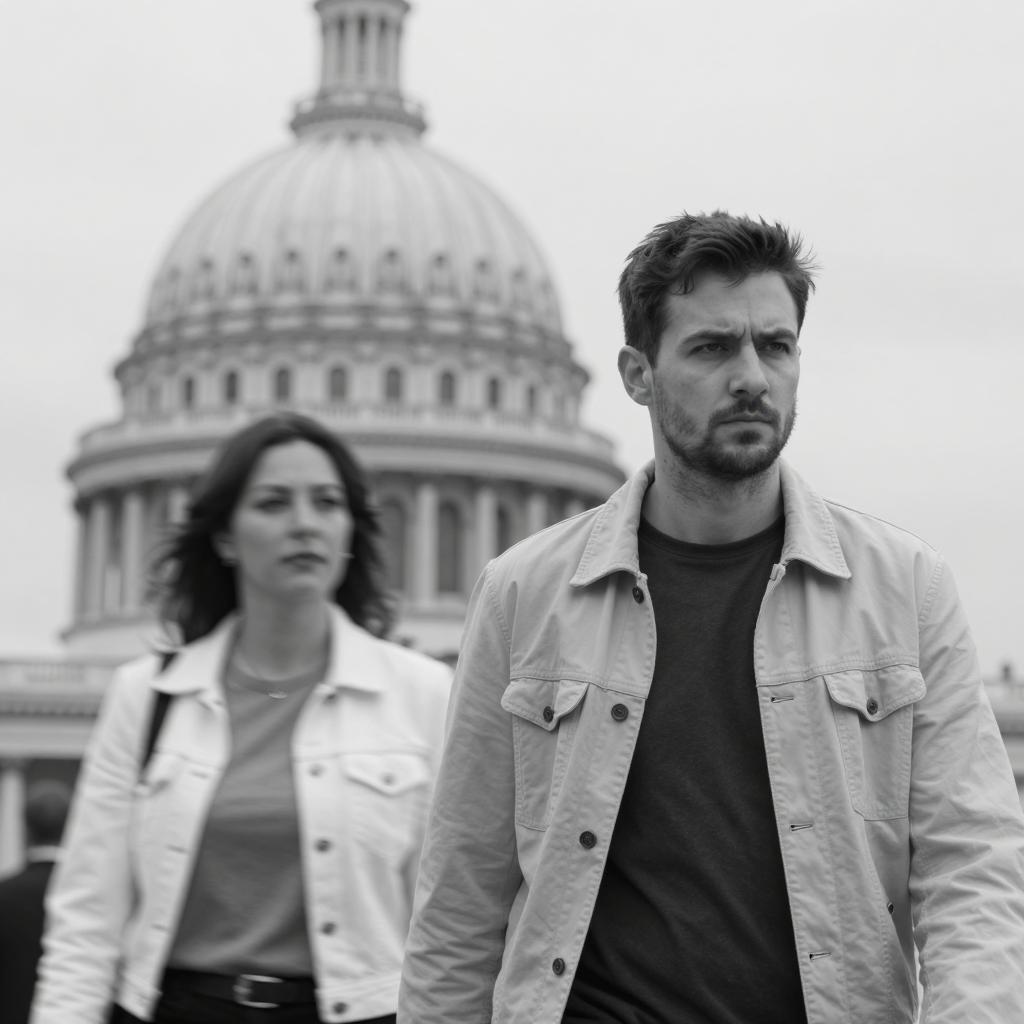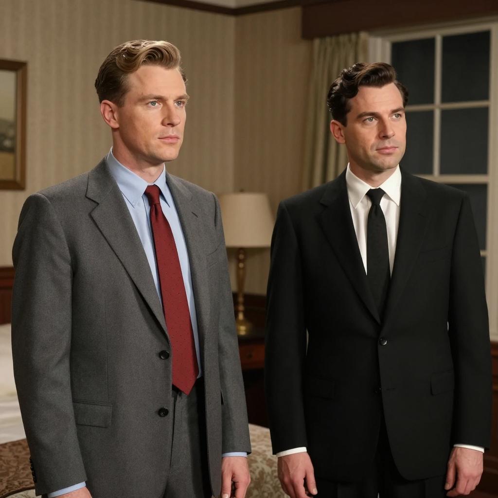 Photograph of a man and woman in a hallway. Man in foreground, right, dark hair, serious expression, brown pinstripe suit, white shirt, black tie. Woman in background, slightly out of focus, light brown hair, green ribbed sweater, gray cape. Wooden door on left, arched stone wall behind. Man's face centered, woman's face to the left, slightly blurred.