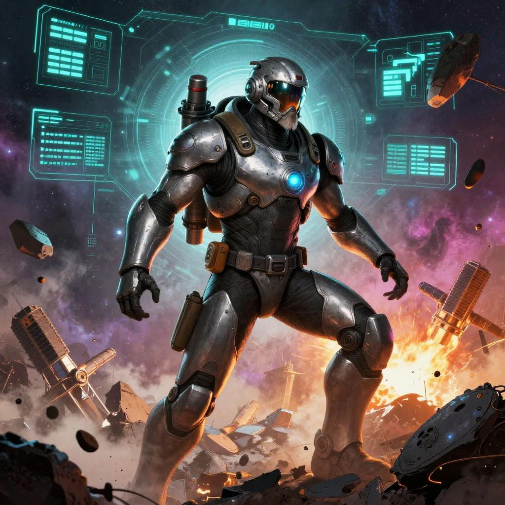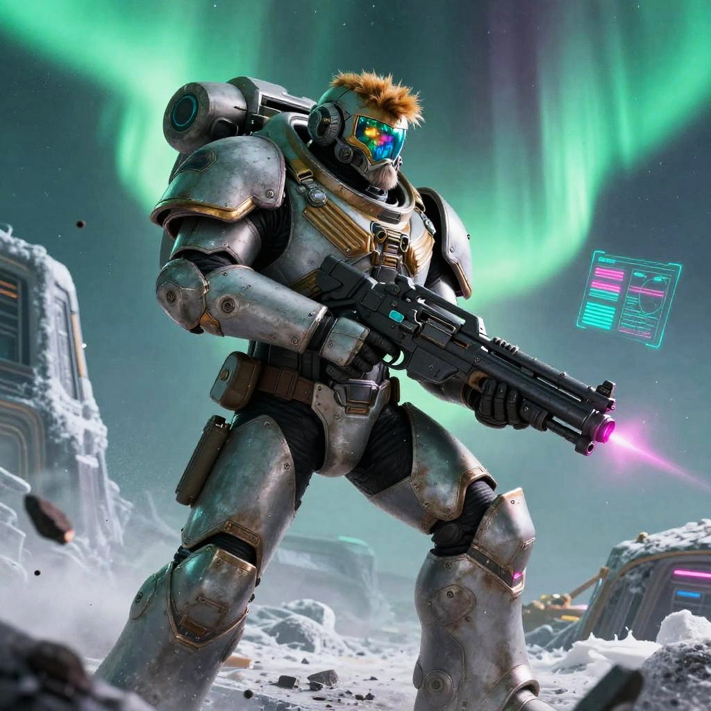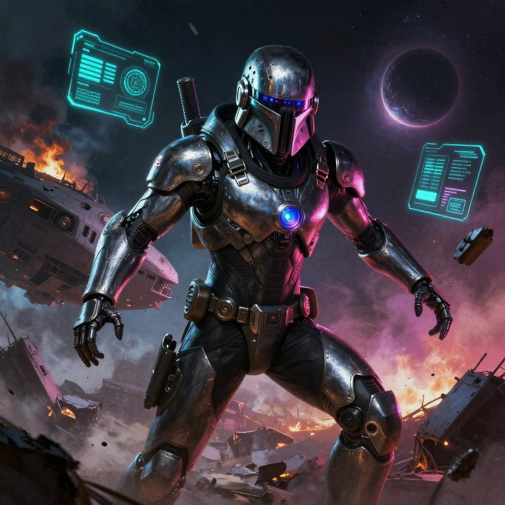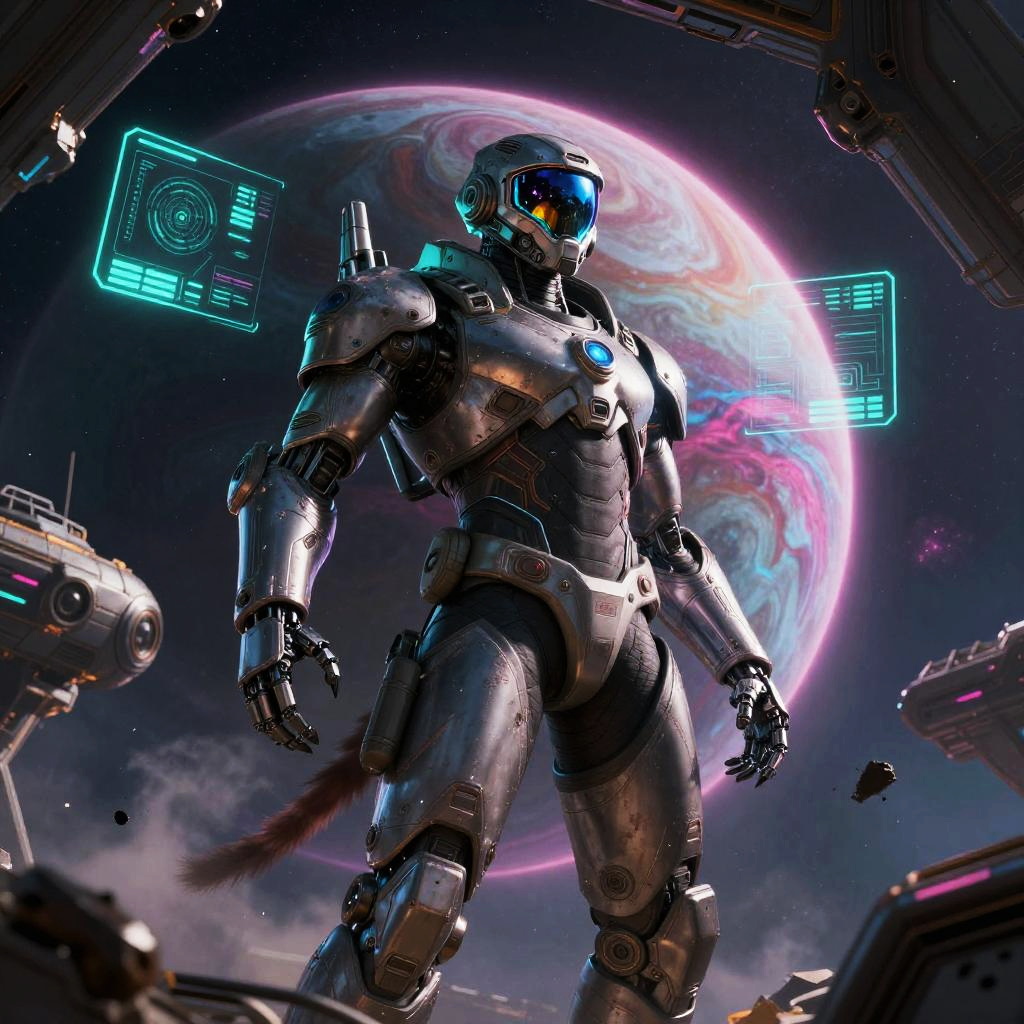 Heroic sci-fi character art of a fearless plasma gunner with glowing red eyes in a sleek armored suit with reflective visor, framed by war-torn space battlefield with shattered ships and firestorms, depicted in a cinematic sci-fi realism with high detail and dramatic lighting. Dynamic pose, zero-gravity debris, volumetric haze, glowing HUD glyphs, vibrant teal and magenta palette, crisp silhouette, high contrast, specular highlights on worn metal, ultra-detailed fur and whiskers, space dust motes, epic mood, story-driven composition.