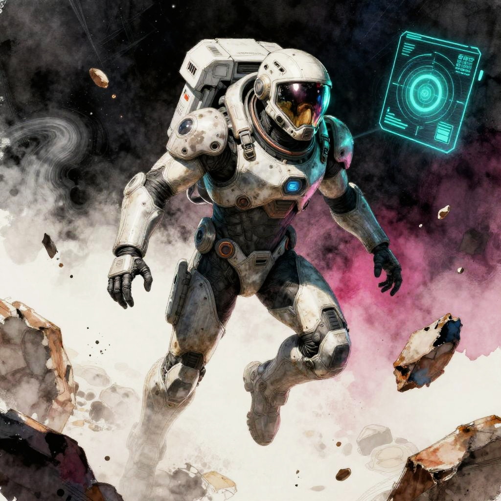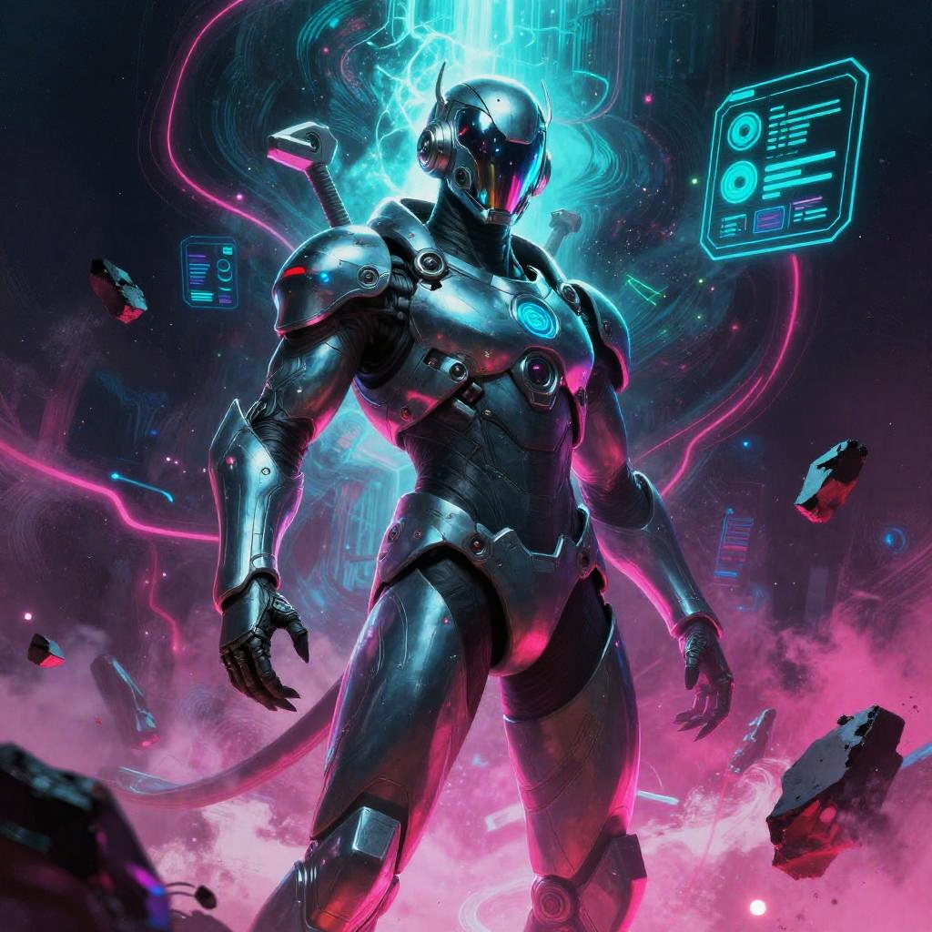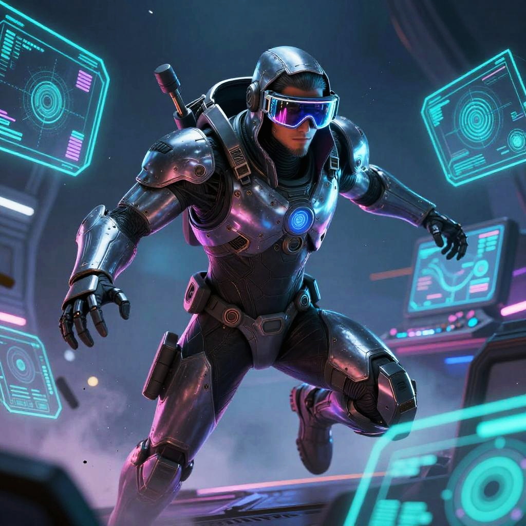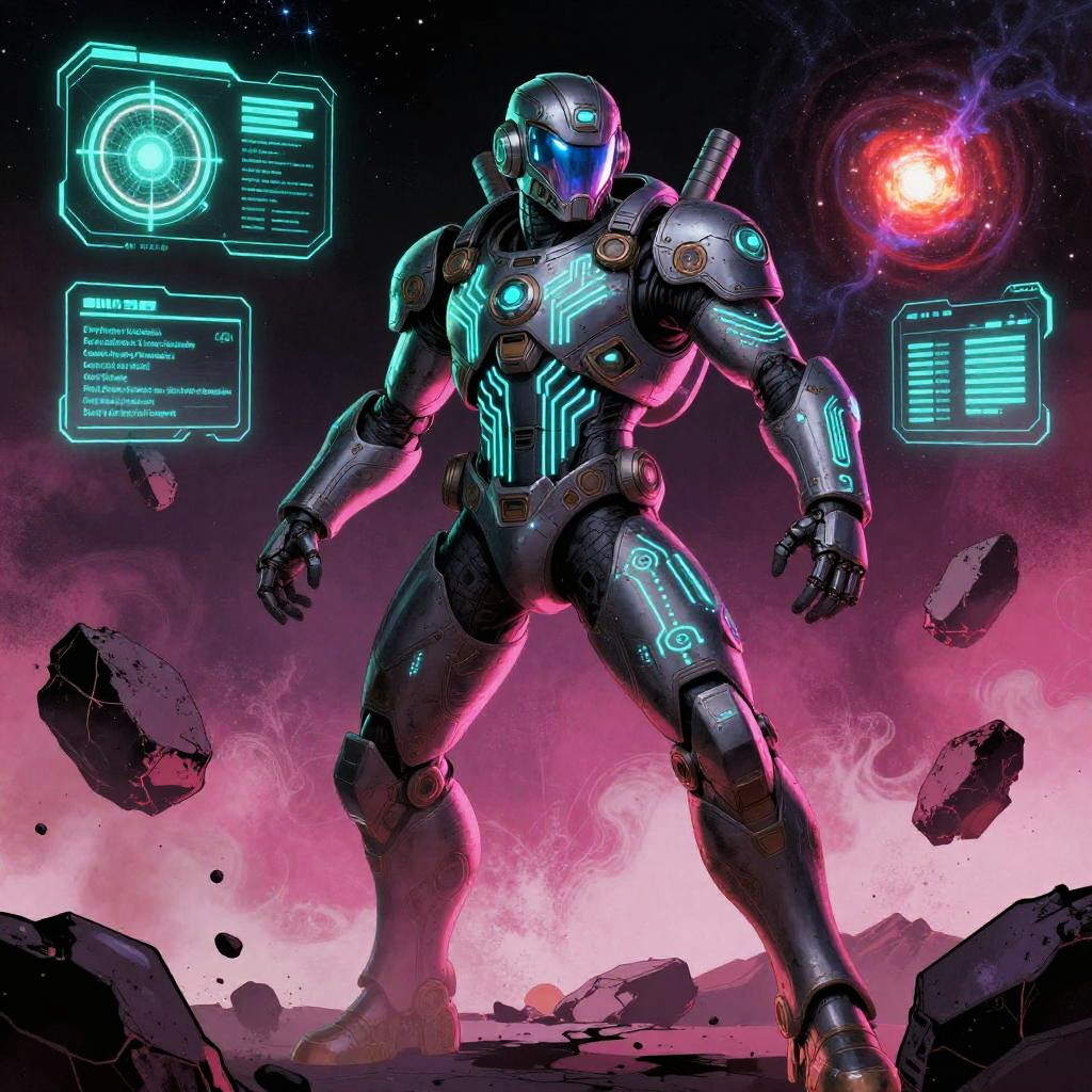 Heroic sci-fi character art of a fearless plasma gunner with glowing red eyes in a sleek armored suit with reflective visor, framed by war-torn space battlefield with shattered ships and firestorms, depicted in a cinematic sci-fi realism with high detail and dramatic lighting. Dynamic pose, zero-gravity debris, volumetric haze, glowing HUD glyphs, vibrant teal and magenta palette, crisp silhouette, high contrast, specular highlights on worn metal, ultra-detailed fur and whiskers, space dust motes, epic mood, story-driven composition.