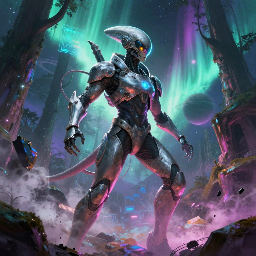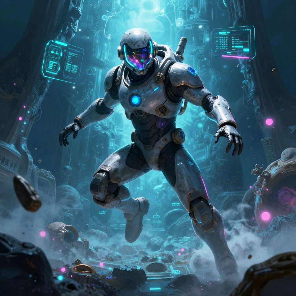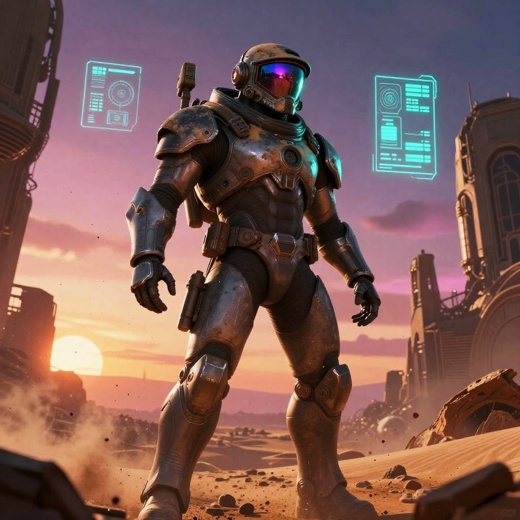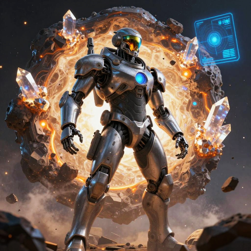 Heroic sci-fi character art of a fearless plasma gunner with glowing red eyes in a sleek armored suit with reflective visor, framed by war-torn space battlefield with shattered ships and firestorms, depicted in a cinematic sci-fi realism with high detail and dramatic lighting. Dynamic pose, zero-gravity debris, volumetric haze, glowing HUD glyphs, vibrant teal and magenta palette, crisp silhouette, high contrast, specular highlights on worn metal, ultra-detailed fur and whiskers, space dust motes, epic mood, story-driven composition.