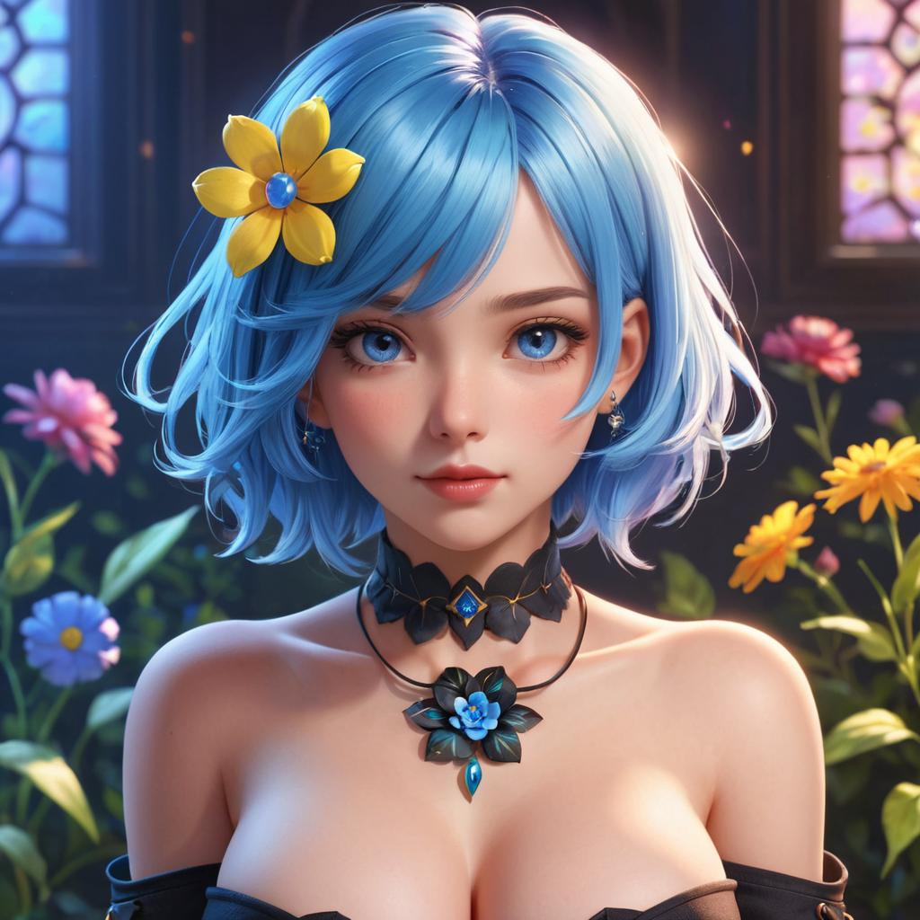 Portrait of a young woman with short, wavy blue hair adorned with a white and a pink daisy. She wears a strapless blue top with black trim and a black choker necklace decorated with blue flowers. She holds a large pink flower near her chest, against a simple grey background.