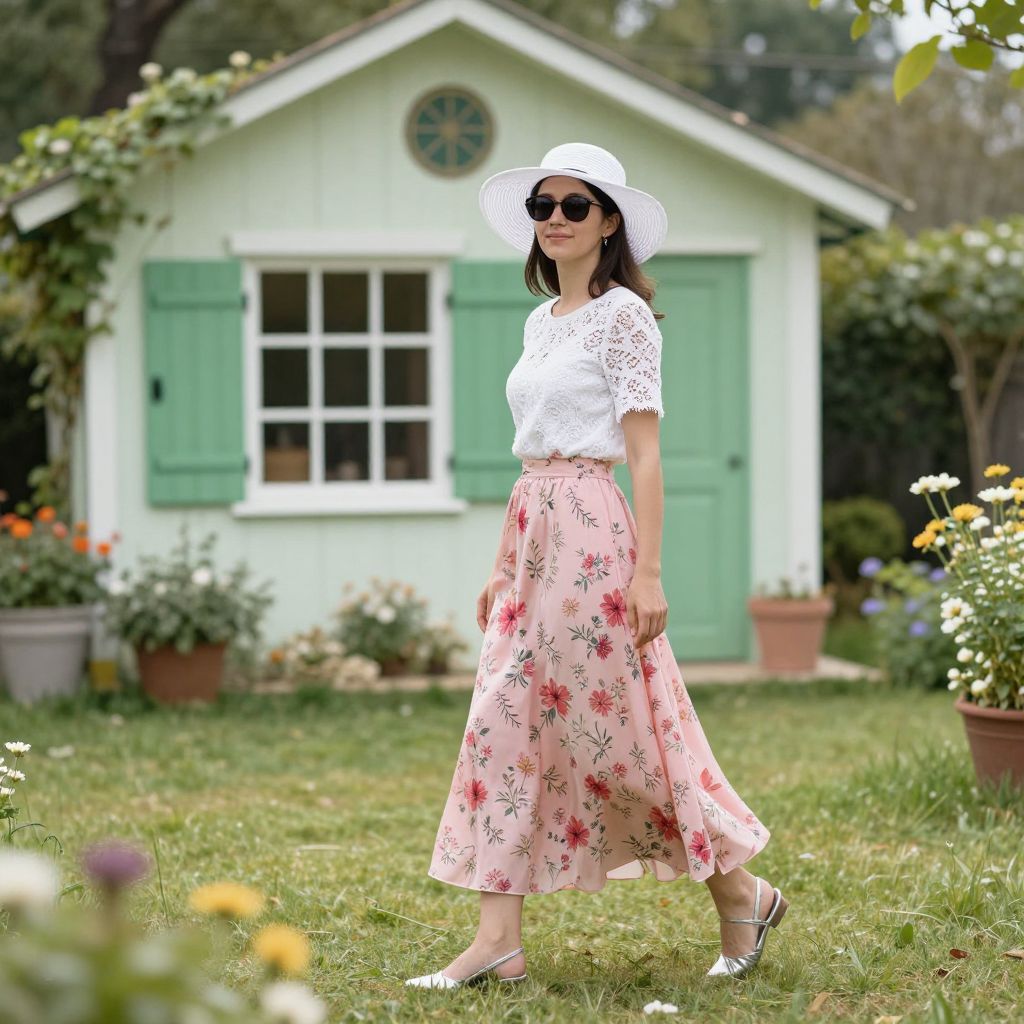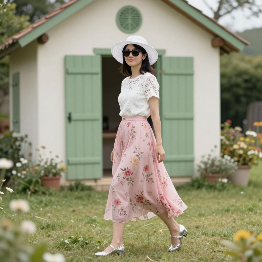 Woman strolling in a serene garden wearing a white sunhat, sunglasses, a white lace top, and a flowing pink floral skirt, complemented by silver heels, with a charming summer house featuring green shutters in the background.
